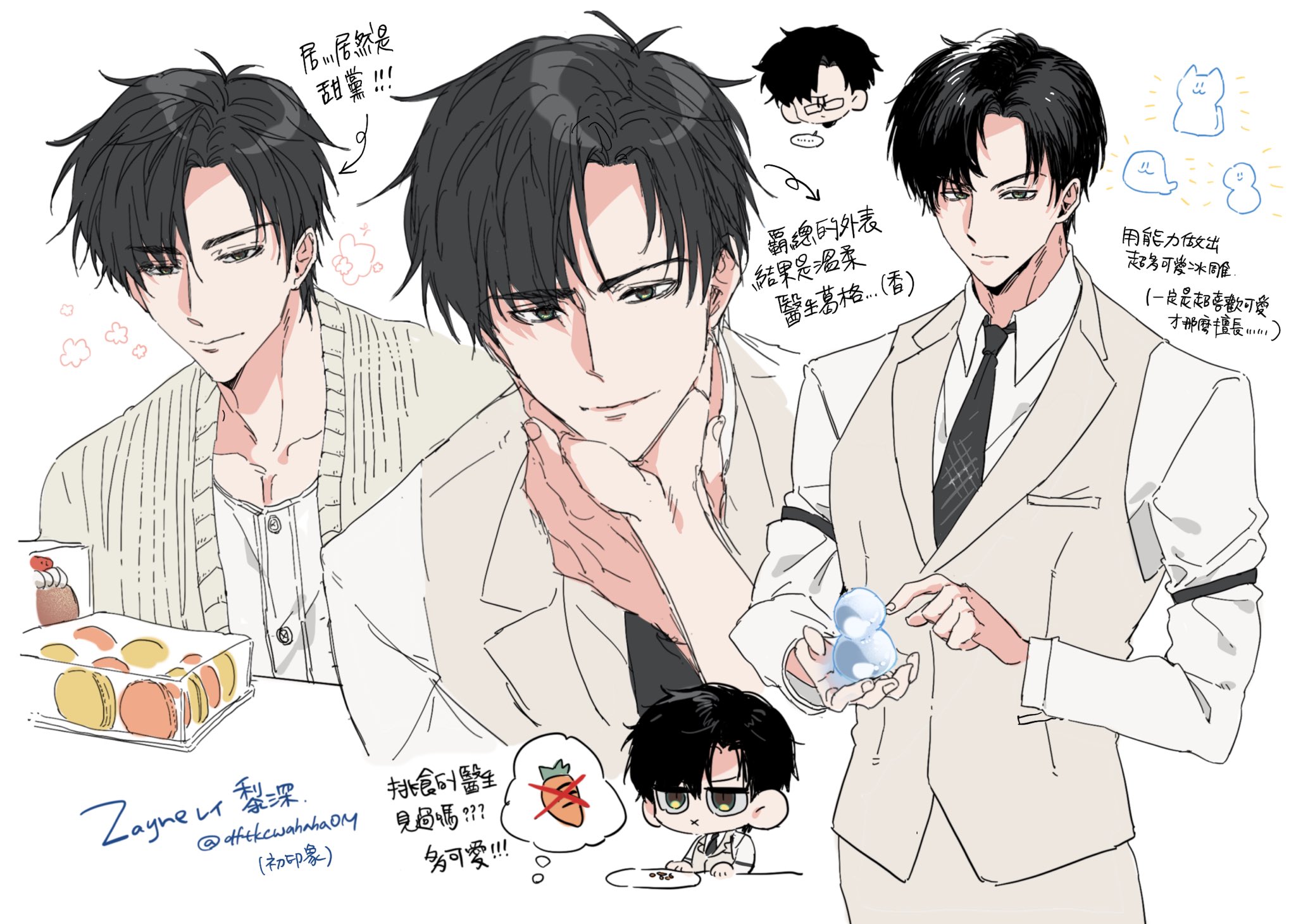 1boy black_hair black_necktie cardigan cheche chibi chinese_commentary chinese_text closed_mouth collared_shirt commentary_request green_eyes highres long_sleeves love_and_deepspace male_focus multiple_views necktie open_cardigan open_clothes pants shirt short_hair smile translation_request vest white_shirt yellow_cardigan yellow_pants yellow_vest zayne_(love_and_deepspace)