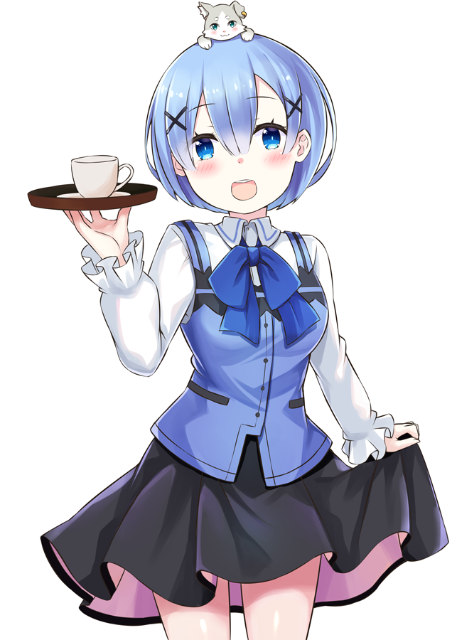 1girl :3 :d alternate_costume animal animal_on_head black_skirt blue_bow blue_eyes blue_vest bow cat closed_mouth commentary_request cosplay cup gochuumon_wa_usagi_desu_ka? hair_between_eyes hair_ornament holding holding_own_skirt holding_tray kafuu_chino kafuu_chino_(cosplay) long_sleeves looking_at_viewer minase_inori on_head open_mouth pink_skirt puck_(re:zero) rabbit_house_uniform re:zero_kara_hajimeru_isekai_seikatsu rem_(re:zero) s_(hdru2332) shirt short_hair simple_background skirt smile solo teeth tray two-sided_fabric two-sided_skirt upper_teeth_only vest voice_actor_connection waitress white_background white_shirt x_hair_ornament