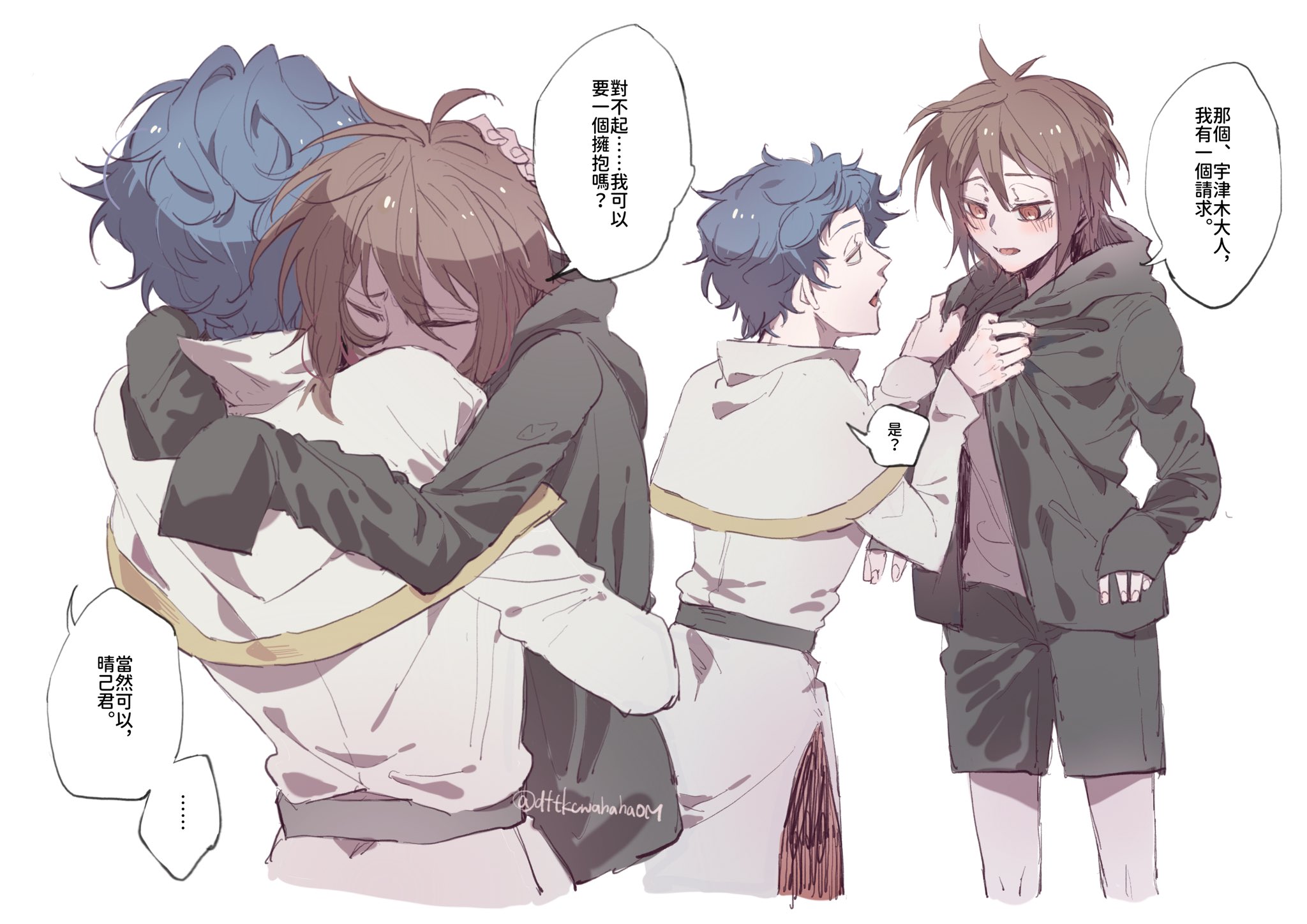 2boys black_jacket blue_eyes brown_hair brown_shorts capelet cheche chinese_commentary chinese_text commentary_request gold_trim hair_between_eyes hand_on_another's_head highres hood hood_down hooded_jacket hug isoi_haruki jacket long_sleeves male_focus multiple_boys open_clothes open_jacket open_mouth red_eyes saibou_shinkyoku shirt short_hair shorts simple_background sleeves_past_fingers sleeves_past_wrists translation_request twitter_username utsugi_noriyuki white_background white_capelet white_shirt