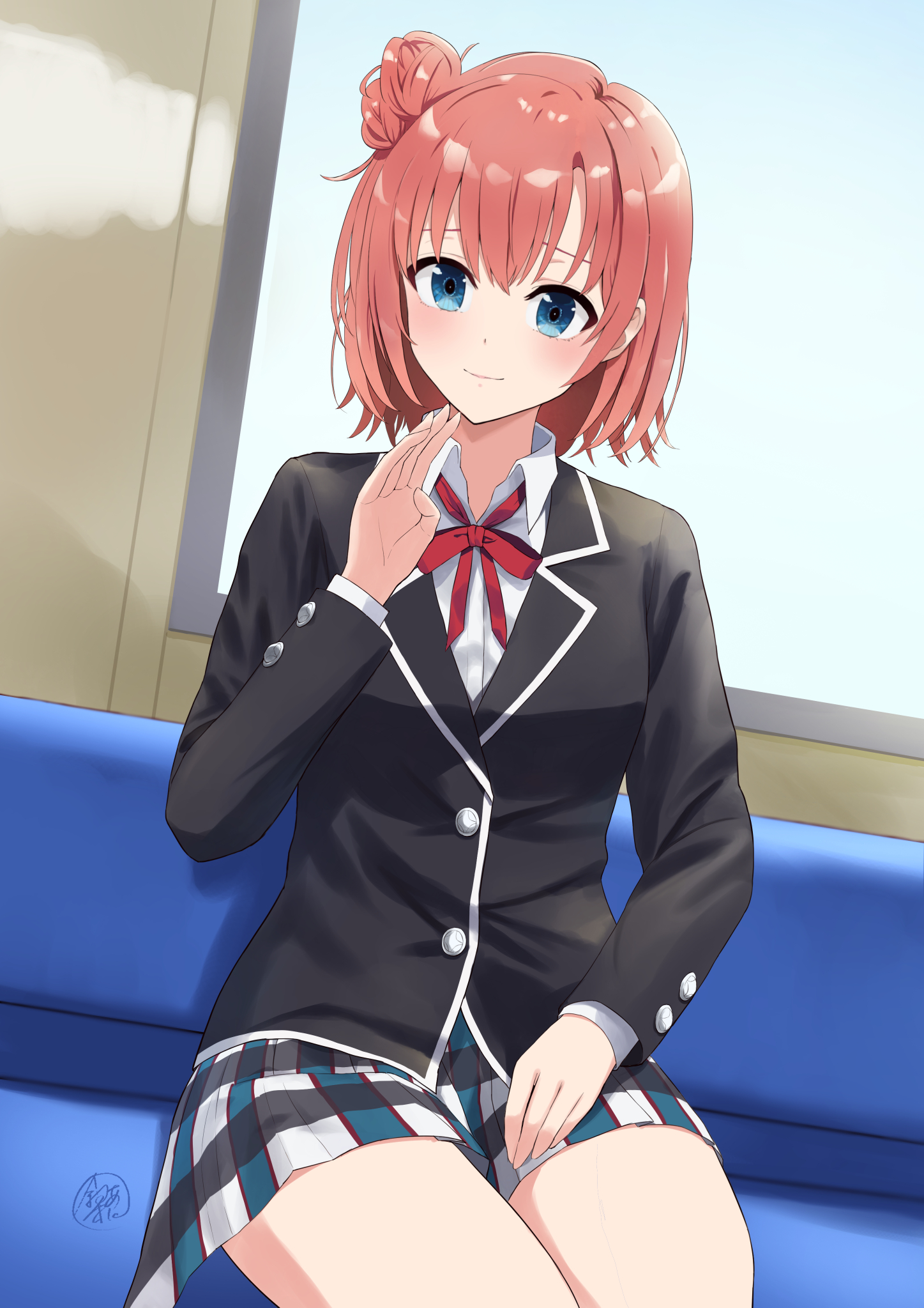 1girl black_jacket blazer blue_eyes blush breasts closed_mouth hair_bun hand_up highres jacket kashiiyou looking_at_viewer neck_ribbon open_mouth pink_hair plaid_clothes plaid_skirt red_ribbon ribbon school_uniform shirt short_hair single_hair_bun single_side_bun sitting skirt smile sobu_high_school_uniform solo thighs white_shirt window yahari_ore_no_seishun_lovecome_wa_machigatteiru. yuigahama_yui