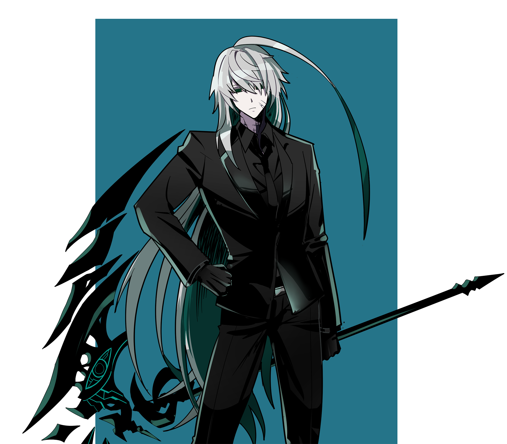1boy ahoge ainchase_ishmael apostasia_(elsword) black_gloves black_jacket black_necktie black_pants black_shirt black_suit blue_background border closed_mouth collared_shirt colored_inner_hair cowboy_shot cracked_skin elsword empty_eyes formal_clothes gloves green_eyes grey_hair hair_over_one_eye hand_on_own_hip highres holding holding_weapon jacket kas2a_rr long_hair long_sleeves looking_at_viewer male_focus multicolored_hair necktie outside_border pants ringed_eyes shirt simple_background solo standing suit very_long_hair weapon white_border wing_collar