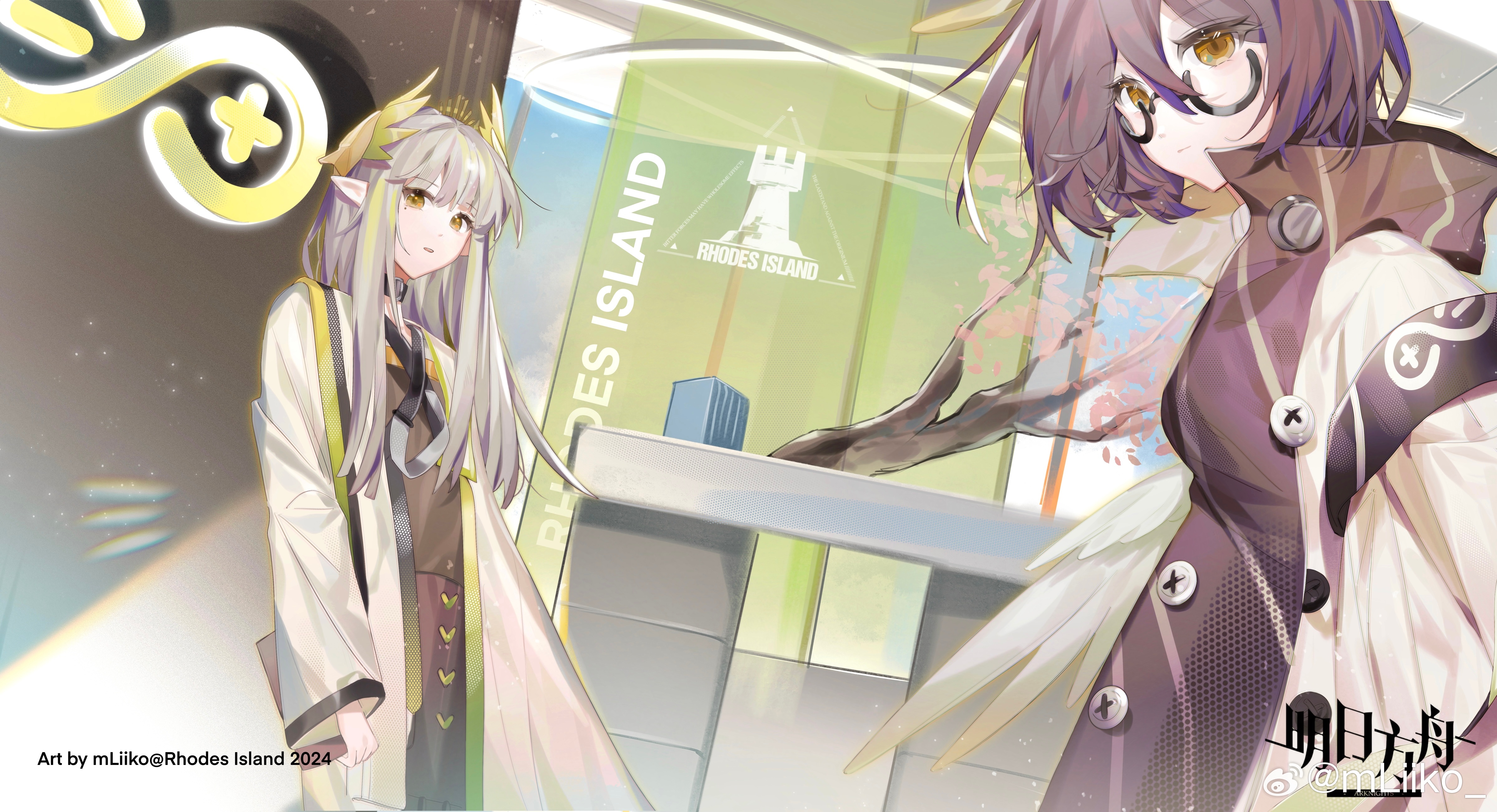 2girls absurdres arknights armband artist_name black-framed_eyewear blonde_hair branch brown_armband brown_dress brown_eyes brown_hair brown_shirt brown_skirt buttons chinese_commentary closed_mouth coat commentary_request copyright_name cross dress elf glasses greek_cross grey_hair grey_wings hair_between_eyes hair_ornament high_collar highres indoors lens_flare light_particles long_hair long_sleeves looking_at_viewer mliiko muelsyse_(arknights) multicolored_hair multiple_girls open_clothes open_coat parted_lips pointy_ears procreate_(medium) rhodes_island_logo_(arknights) semi-rimless_eyewear shirt short_hair silence_(arknights) skirt streaked_hair two-tone_hair under-rim_eyewear watermark weibo_watermark weibo_watermark white_coat wings
