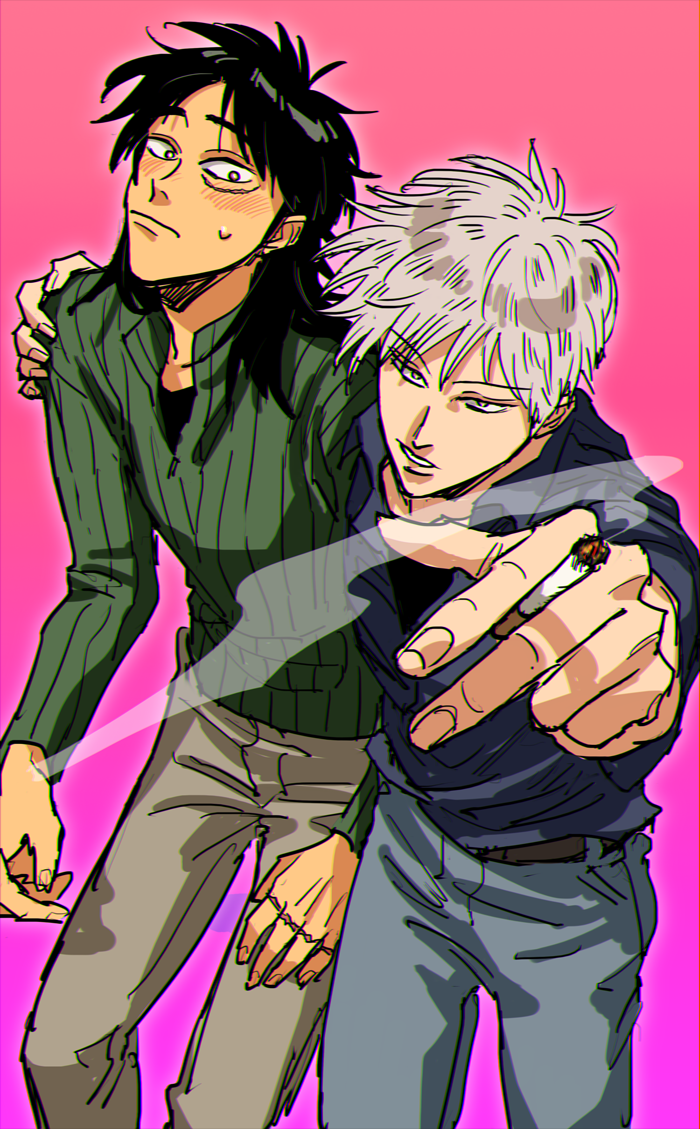 2boys akagi:_yami_ni_oritatta_tensai akagi_shigeru black_hair black_shirt blush brown_eyes brown_pants cigarette closed_mouth commentary_request feet_out_of_frame fukumoto_mahjong gradient_background green_sweater grey_hair grey_pants grey_shirt hand_on_another's_shoulder holding holding_cigarette itou_kaiji tobaku_mokushiroku_kaiji long_hair long_sleeves looking_at_viewer male_focus multiple_boys pants pink_background shirt short_hair smoke sweater wataroux