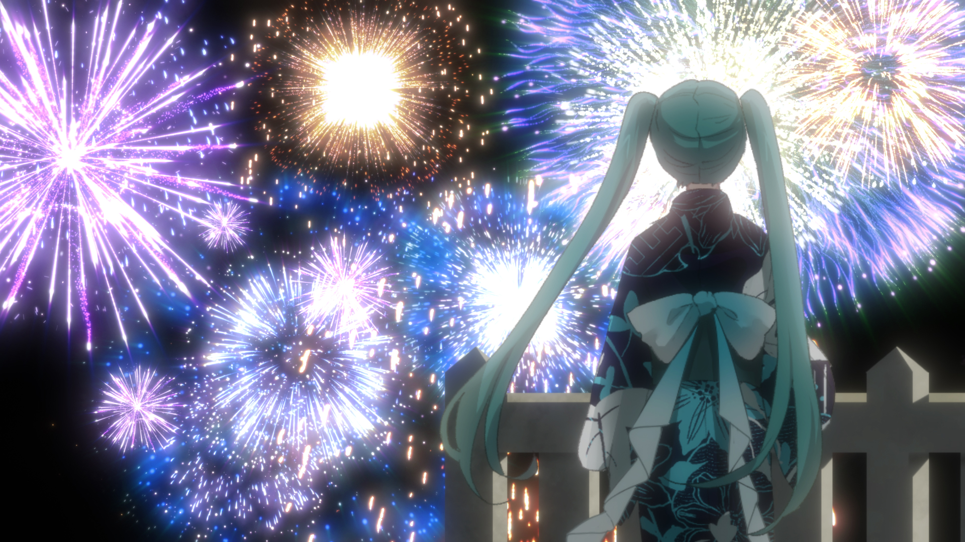 1girl aerial_fireworks arms_at_sides commentary_request facing_away fireworks hatsune_miku highres japanese_clothes kimono koniro long_hair long_sleeves night print_kimono railing solo twintails very_long_hair vocaloid