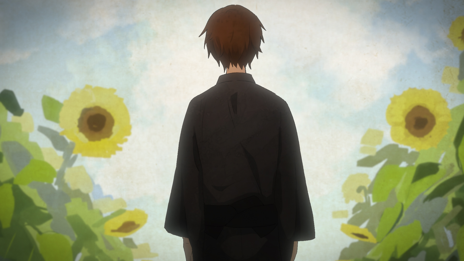 1boy arms_at_sides black_kimono brown_hair character_request commentary_request facing_away flower from_behind highres japanese_clothes kimono koniro long_sleeves male_focus outdoors short_hair solo standing sunflower vocaloid yellow_flower
