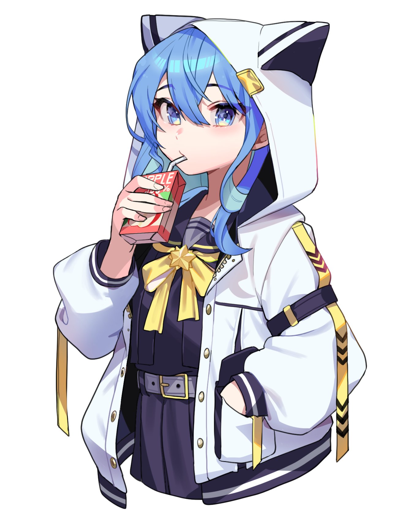 1girl animal_hood belt black_sailor_collar black_serafuku black_shirt black_skirt blue_eyes blue_hair bow bowtie cat_hood cropped_legs drink drink_carton drinking drinking_straw drinking_straw_in_mouth gachop99 grey_belt hair_between_eyes hand_in_pocket highres holding holding_drink hololive hood hood_up hooded_jacket hoshimachi_suisei hoshimachi_suisei_(sailor) jacket juice juice_box long_sleeves looking_at_viewer official_alternate_costume open_clothes open_jacket pleated_skirt sailor_collar school_uniform serafuku shirt simple_background skirt solo star_(symbol) star_in_eye symbol_in_eye virtual_youtuber white_background white_jacket yellow_bow yellow_bowtie