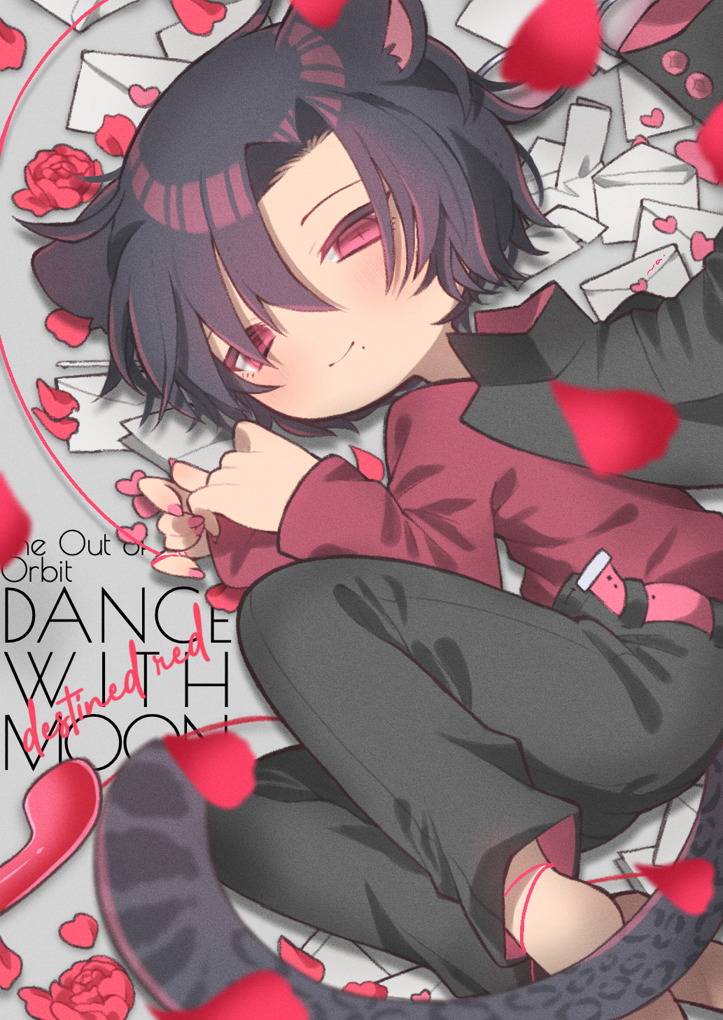 1girl animal_ears barefoot belt black_hair black_pants closed_mouth english_text envelope hair_between_eyes highres leopard_ears leopard_girl leopard_tail lying omoi_(omochan) on_side original pants pink_belt red_eyes red_shirt shirt short_hair slit_pupils smile solo tail valentine