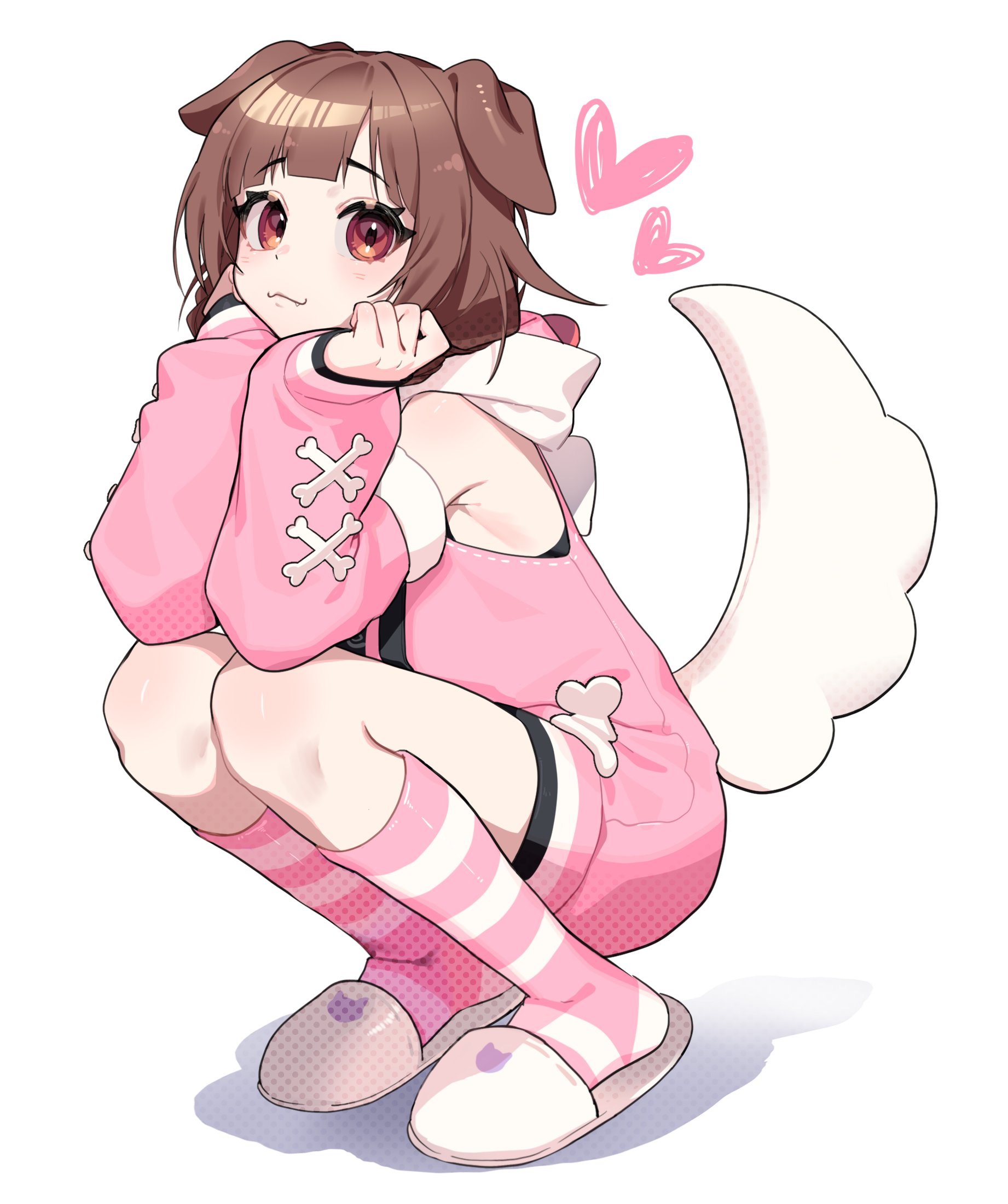1girl :3 animal_ears arm_rest bare_shoulders blunt_bangs blush brown_hair closed_mouth detached_sleeves dog_ears dog_girl dog_tail full_body gachop99 head_rest heart highres hololive hood hood_down hoodie inugami_korone inugami_korone_(roomwear) long_sleeves looking_at_viewer medium_hair official_alternate_costume pink_hoodie pink_sleeves pink_socks red_eyes simple_background sleeveless slippers smile socks solo squatting striped_clothes striped_socks tail virtual_youtuber white_background