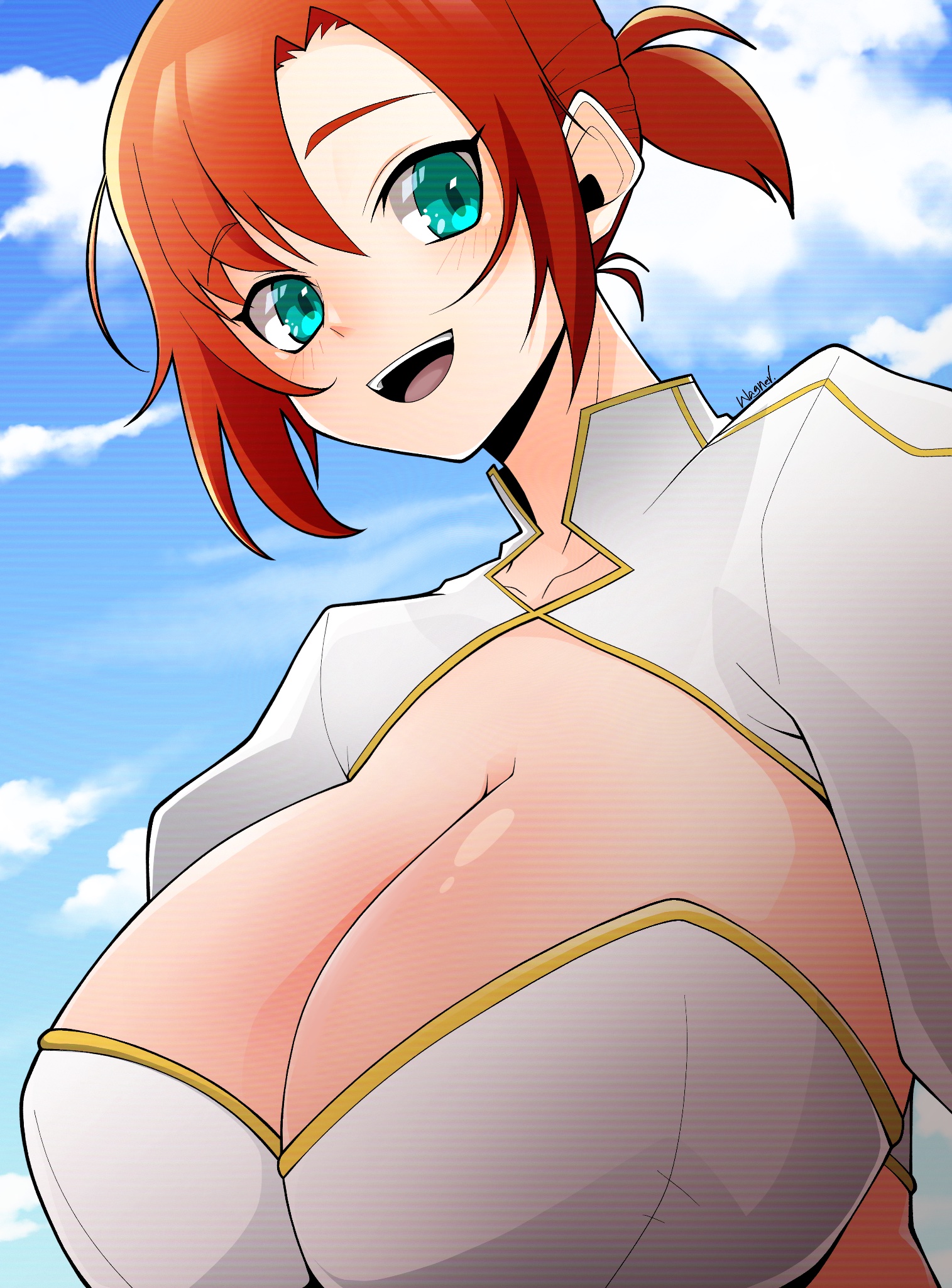1girl boudica_(fate) bra breasts cloud cloudy_sky collarbone fate/grand_order fate_(series) green_eyes highres large_breasts open_mouth ponytail red_hair short_ponytail signature sky smile solo underwear wagu_neru