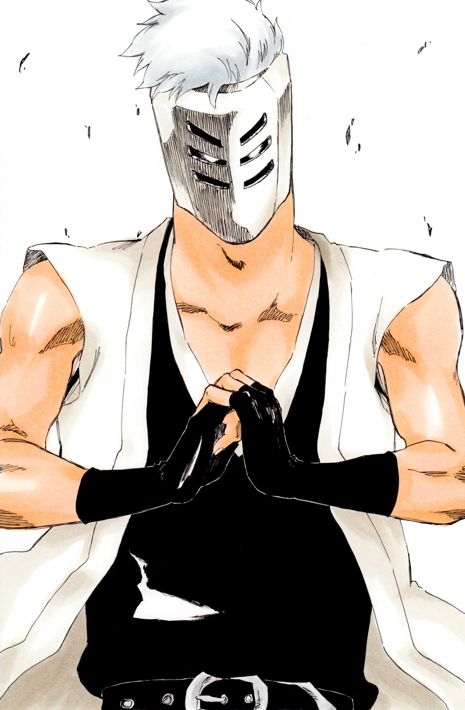 1boy belt black_belt black_gloves black_shirt bleach collarbone commentary_request fingerless_gloves fist_in_hand gloves glowing glowing_eyes grey_hair haori highres japanese_clothes ken'ichi_(ken1ro_u) kubo_tite_(style) looking_at_viewer mask muguruma_kensei muscular muscular_male official_style shirt short_hair simple_background sleeveless sleeveless_shirt solo spiked_hair straight-on upper_body white_background white_mask