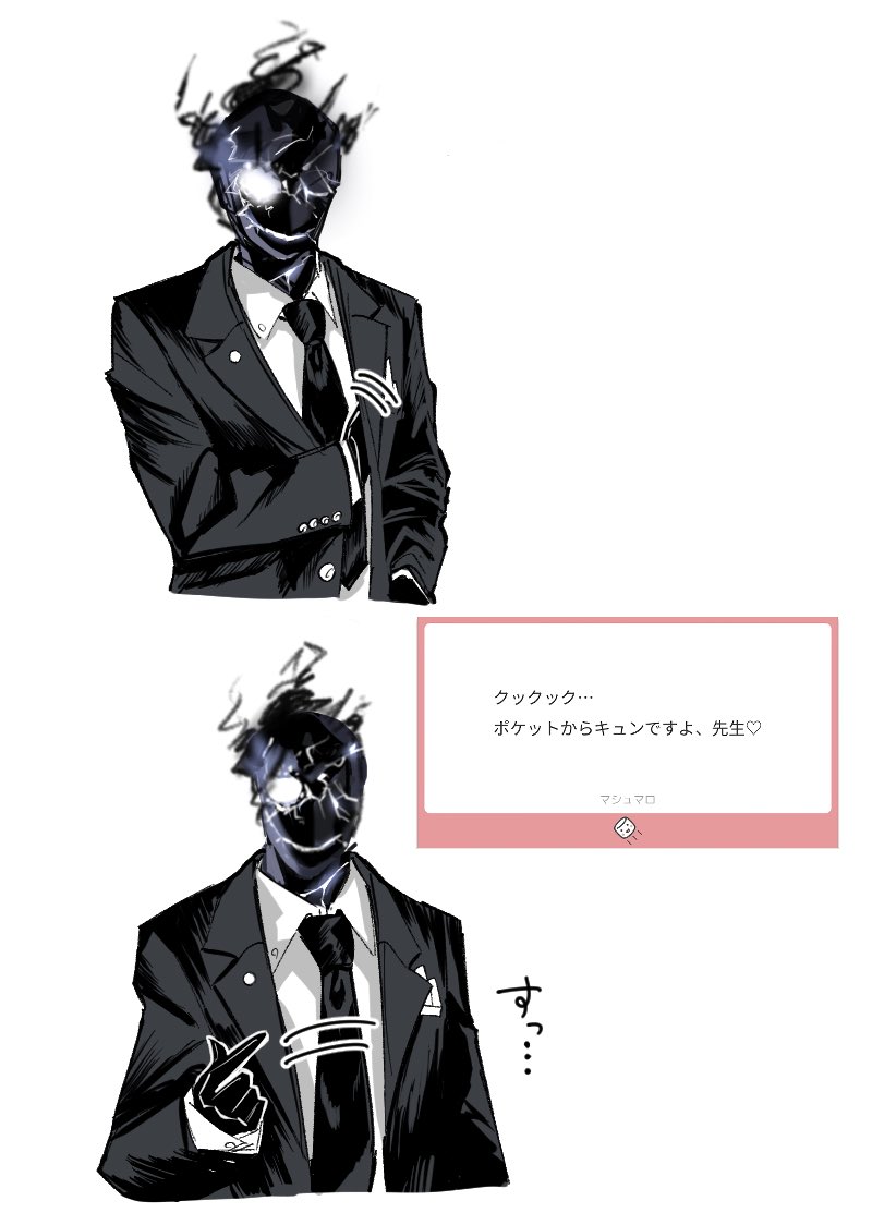 1boy black_necktie black_suit_(blue_archive) blue_archive bobonasudan collared_shirt commission finger_heart formal_clothes long_sleeves looking_at_viewer male_focus marshmallow_(site) motion_lines multiple_views necktie request_inset shirt simple_background smile suit white_background white_shirt