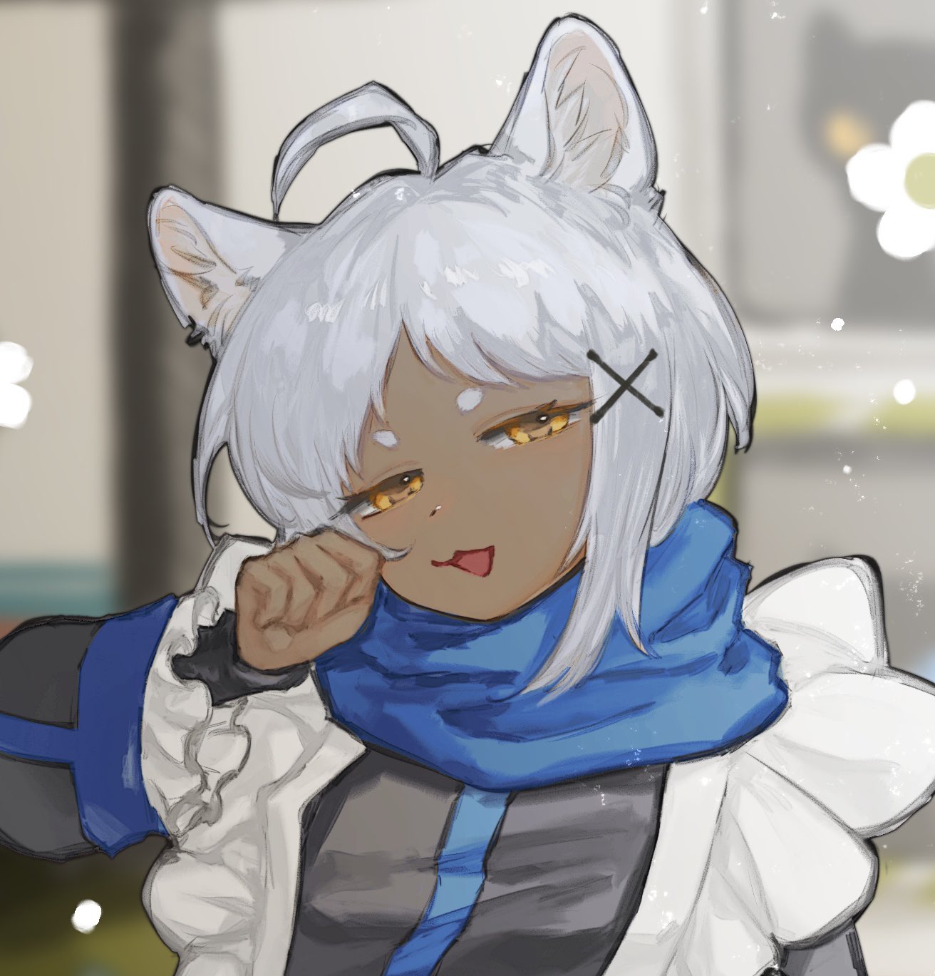 1girl :3 ahoge animal_ears apron aya_(project_moon) blue_scarf cat_ears hand_up highres limbus_company maid maid_apron multicolored_hair open_mouth paw_pose project_moon scarf shan23852196 short_hair sidelocks smile solo streaked_hair unusually_open_eyes white_hair x_(symbol) yellow_eyes