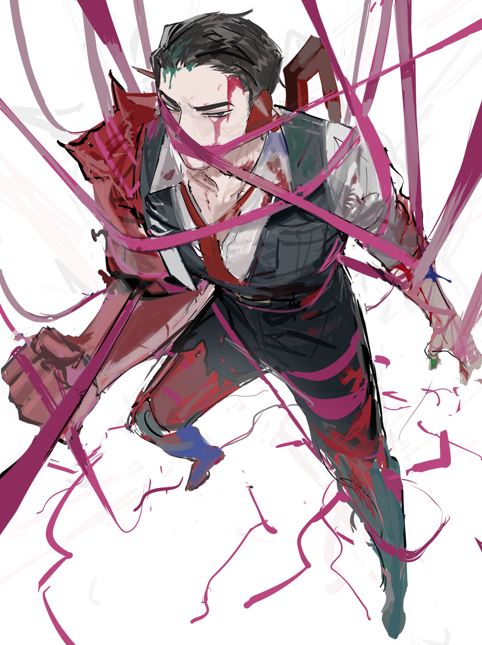 1boy black_hair black_pants black_vest blood blood_on_clothes collared_shirt e.g.o_(project_moon) from_above full_body hair_slicked_back highres limbus_company looking_at_viewer meursault_(project_moon) necktie niku_0000 pants pink_blood pink_shoes_(project_moon) project_moon purple_eyes red_necktie roseate_desire_(e.g.o) screwloose_wallop_(e.g.o) shirt simple_background solo vest white_background white_shirt