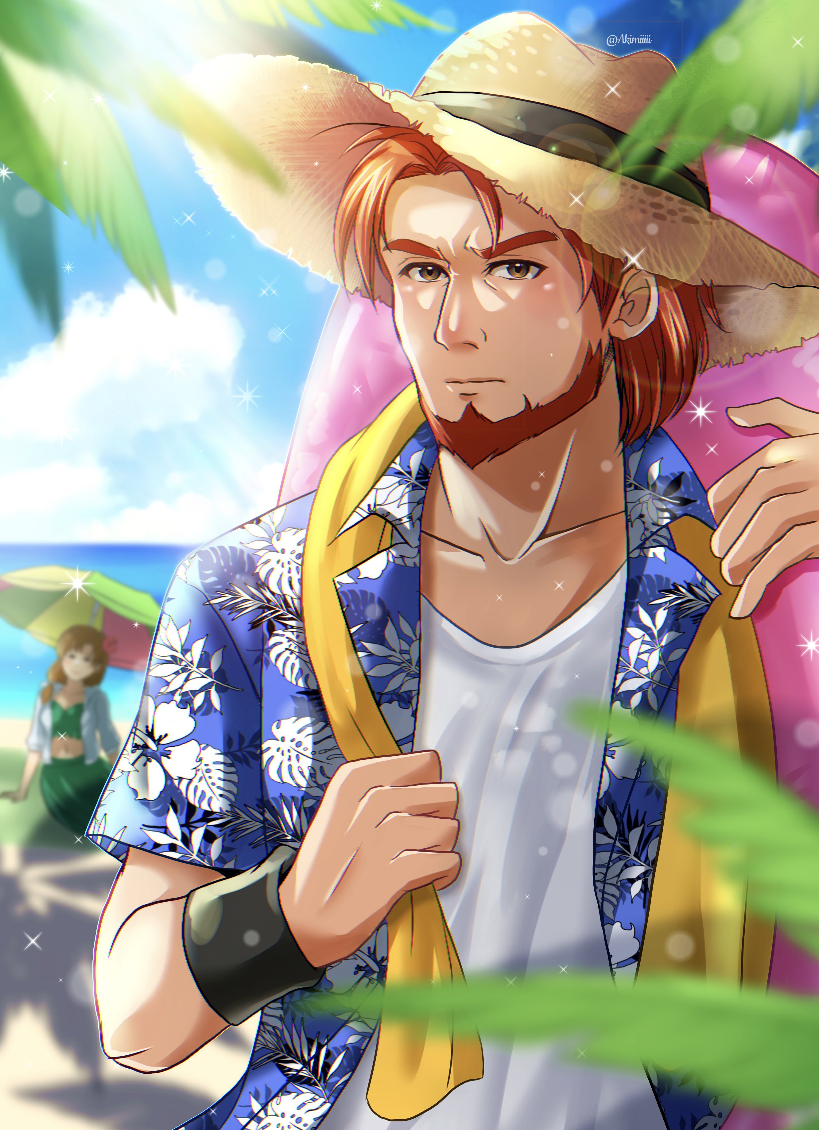 1boy 1girl absurdres akimiiiii alternate_costume beard brown_eyes brown_hair couple dorcas_(fire_emblem) facial_hair fire_emblem fire_emblem:_the_blazing_blade fire_emblem_heroes hawaiian_shirt hetero highres long_hair muscular natalie_(fire_emblem) nintendo red_hair shirt short_hair