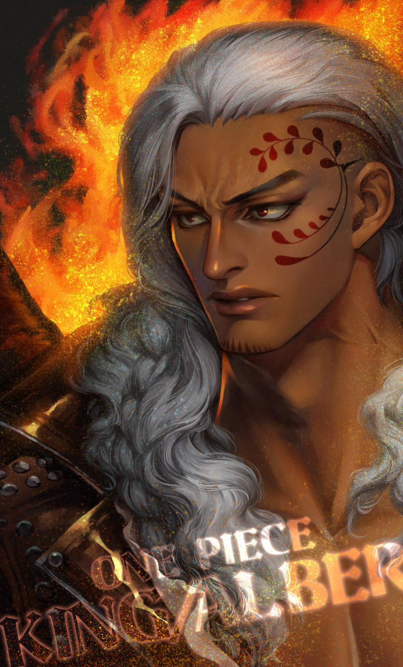 1boy character_name commentary commentary_request dark-skinned_male dark_skin english_commentary english_text facial_hair facial_tattoo fire goatee highres king_(one_piece) long_hair male_focus mixed-language_commentary one_piece realistic red_eyes solo tattoo white_hair yona_(edenkasuga)