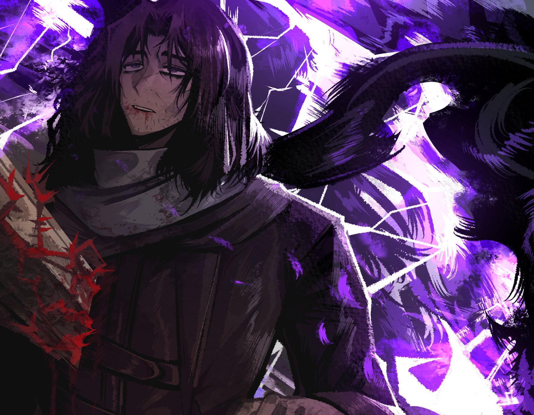 1boy barbed_wire beard_stubble blood blood_from_mouth brown_coat brown_hair coat erlking_heathcliff_(project_moon) facial_hair heathcliff_(project_moon) highres impaled lightning limbus_company looperioo medium_hair project_moon purple_eyes scar scar_on_face scarf solo stubble sword weapon