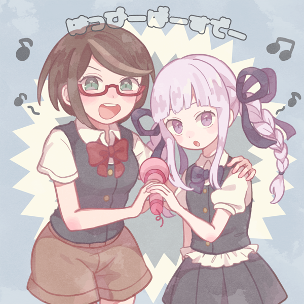 2girls black_skirt black_vest blue_background blunt_bangs bow bowtie braid breasts brown_hair brown_shorts buttons collared_shirt commentary_request cowboy_shot danganronpa danganronpa_(series) danganronpa_kirigiri eyelashes frilled_shirt frills glasses green_eyes hair_ribbon hand_on_another's_shoulder holding holding_microphone kirigiri_kyoko long_hair medium_breasts microphone mikuni_(open-ranka) miniskirt multicolored_hair multiple_girls musical_note open_mouth pleated_skirt puffy_short_sleeves puffy_sleeves purple_bow purple_bowtie purple_eyes purple_hair purple_ribbon red-framed_eyewear red_bow red_bowtie ribbon samidare_yui sharing shirt short_hair short_sleeves shorts sidelocks simple_background skirt smile streaked_hair teeth translation_request twin_braids upper_teeth_only v-shaped_eyebrows vest white_shirt