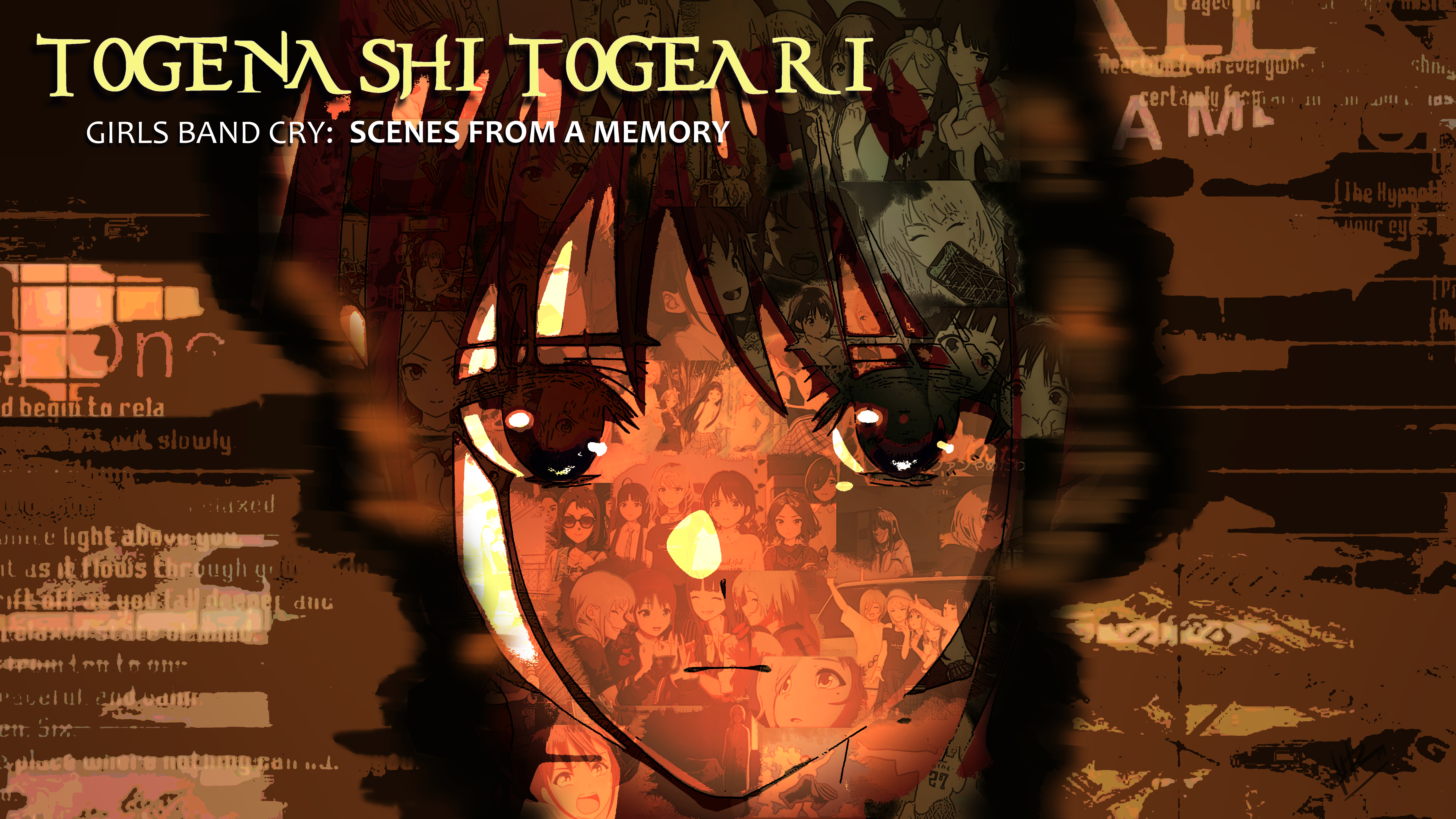 1girl absurdres album_cover_redraw awa_subaru closed_mouth cracked_phone derivative_work dream_theater ebizuka_tomo english_text expressionless girls_band_cry highres iseri_nina kawaragi_momoka long_hair mole mole_under_eye nameless_neet official_art_inset red_eyes rupa_(girls_band_cry) scenes_from_a_memory short_hair short_twintails smile solo sunglasses togenashi_togeari twintails
