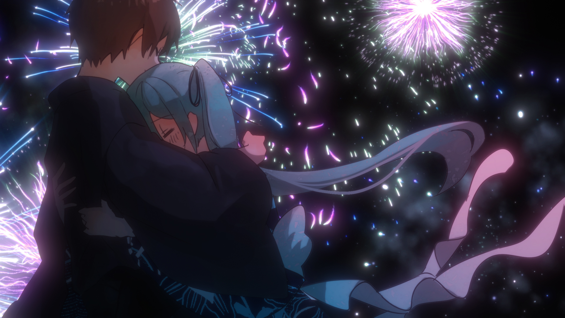 1boy 1girl aerial_fireworks black_kimono blue_hair blush brown_hair character_request closed_eyes fireworks floral_print floral_print_kimono hatsune_miku hetero highres hug japanese_clothes kimono koniro long_hair night outdoors print_kimono short_hair twintails vocaloid