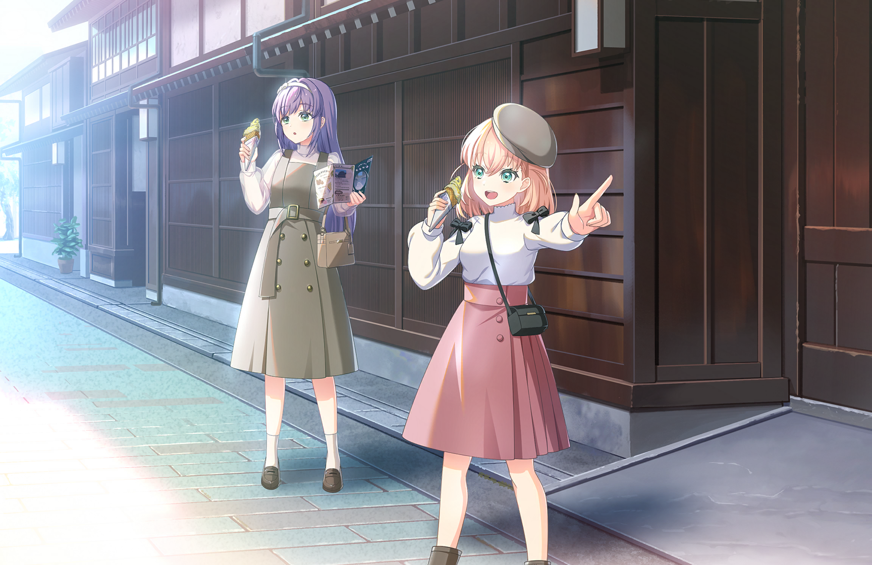 2girls aqua_eyes architecture bag beret black_bag black_footwear breasts brick_road brown_bag brown_dress brown_hat crossed_bangs dress east_asian_architecture food game_cg green_eyes grey_shirt hair_down hairband handbag hat high-waist_skirt highres hinoshita_kaho hinoshita_kaho_(first_date) holding holding_food holding_ice_cream holding_ice_cream_cone ice_cream ice_cream_cone link!_like!_love_live! loafers long_hair long_sleeves love_live! medium_breasts medium_dress medium_hair medium_skirt multiple_girls official_alternate_costume official_alternate_hairstyle official_art orange_hair otomune_kozue otomune_kozue_(first_date) outdoors pinafore_dress pink_skirt pleated_skirt puffy_long_sleeves puffy_sleeves purple_hair see-through_clothes see-through_shirt shirt shoes shoulder_bag sidelocks skirt sleeveless sleeveless_dress socks standing third-party_source tilted_headwear turtleneck turtleneck_shirt two_side_up virtual_youtuber white_hairband white_shirt white_socks