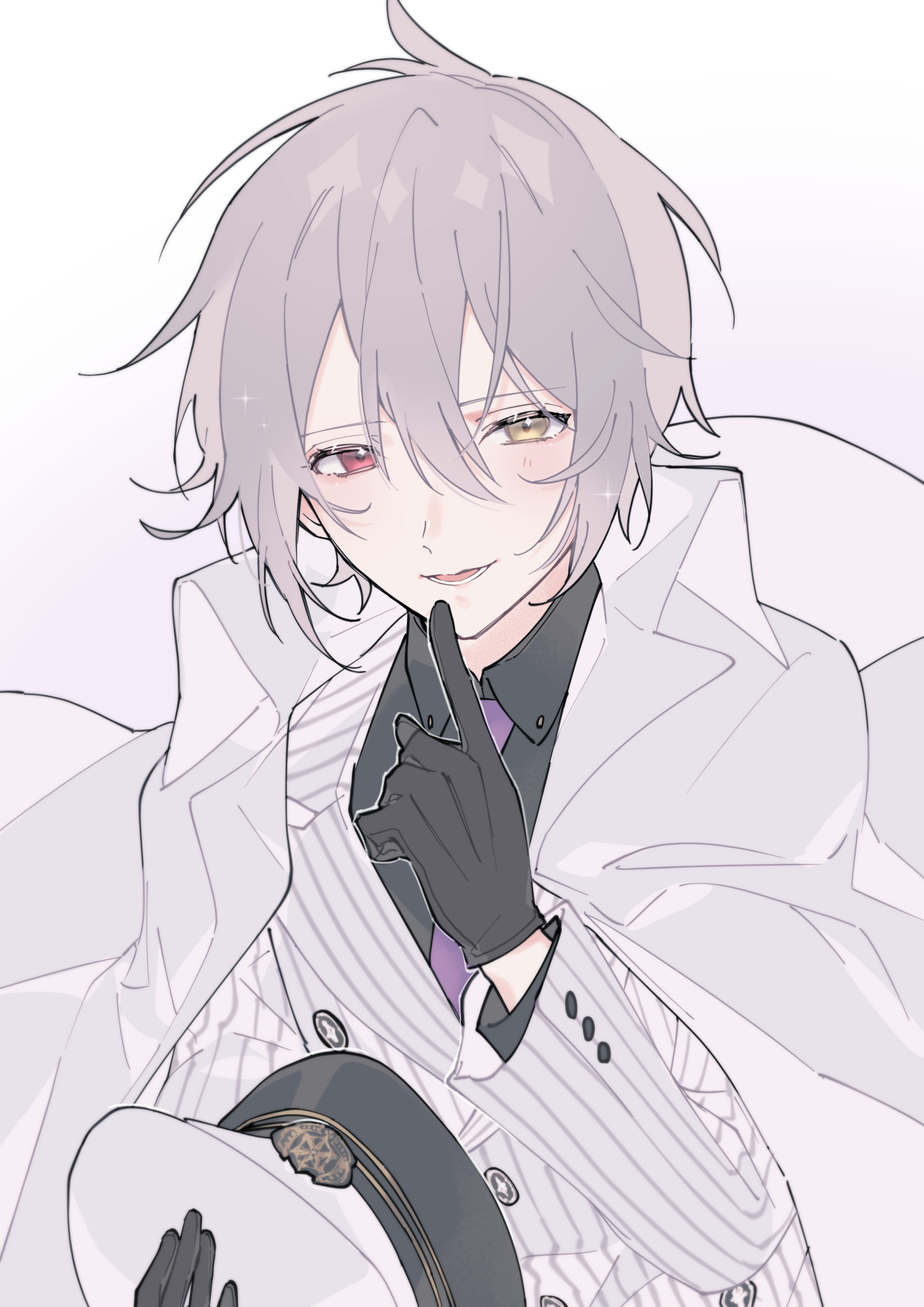 1boy absurdres bishounen black_gloves black_shirt coat collared_shirt eyelashes finger_to_mouth gloves grey_background hair_between_eyes hat heterochromia highres holding holding_unworn_clothes holding_unworn_hat jacket long_sleeves looking_at_viewer lower_teeth_only mahoutsukai_no_yakusoku male_focus necktie owen_(mahoutsukai_no_yakusoku) purple_necktie red_eyes shimogu shirt short_hair simple_background solo teeth unworn_hat unworn_headwear white_coat white_jacket yellow_eyes