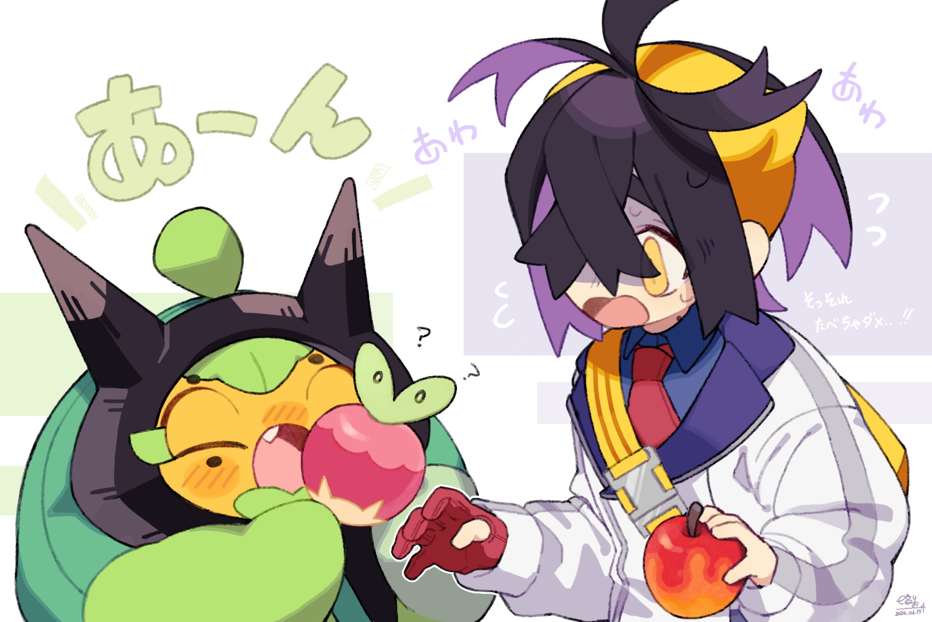 1boy 217_shion_407 ? apple applin black_hair blue_shirt blush closed_eyes collared_shirt crossed_bangs dated fang flying_sweatdrops food fruit gen_8_pokemon gloves hair_between_eyes hairband highres holding holding_food holding_fruit jacket kieran_(pokemon) long_sleeves male_focus mole mole_on_neck multicolored_hair nintendo ogerpon open_mouth partially_fingerless_gloves pokemon pokemon_(creature) pokemon_scarlet_and_violet purple_hair red_gloves shaded_face shirt signature simple_background single_glove sweat translation_request upper_body white_jacket yellow_eyes