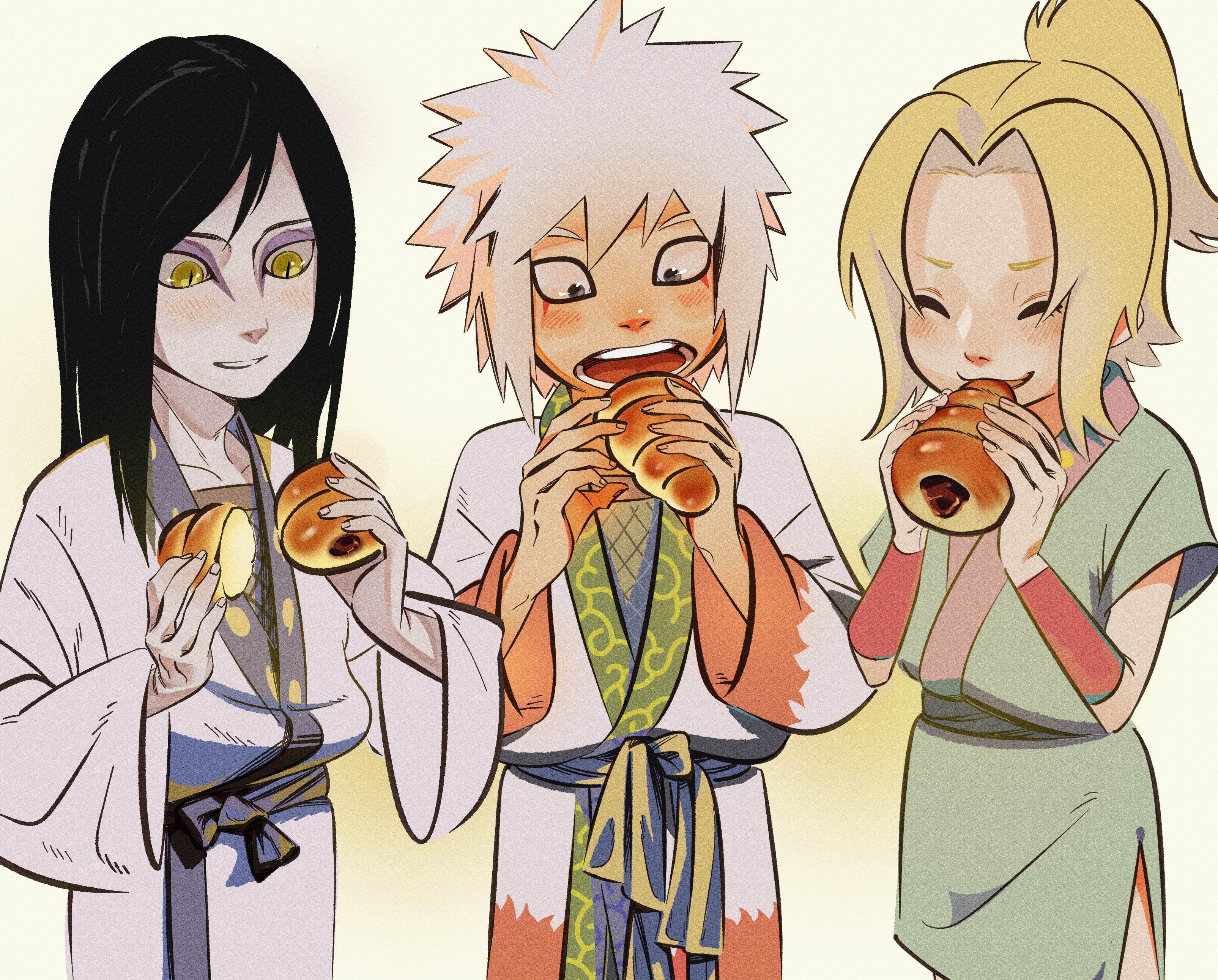 1girl ^_^ absurdres aged_down black_hair blonde_hair closed_eyes eating eyeliner facial_mark fishnets food hair_tied_up highres holding holding_food japanese_clothes jiraiya_(naruto) kimono makeup multiple_boys naruto_(classic) naruto_(series) open_mouth orochimaru_(naruto) pale_skin slit_pupils smile spiked_hair tsunade_(naruto) u9eba/ym white_hair yellow_eyes