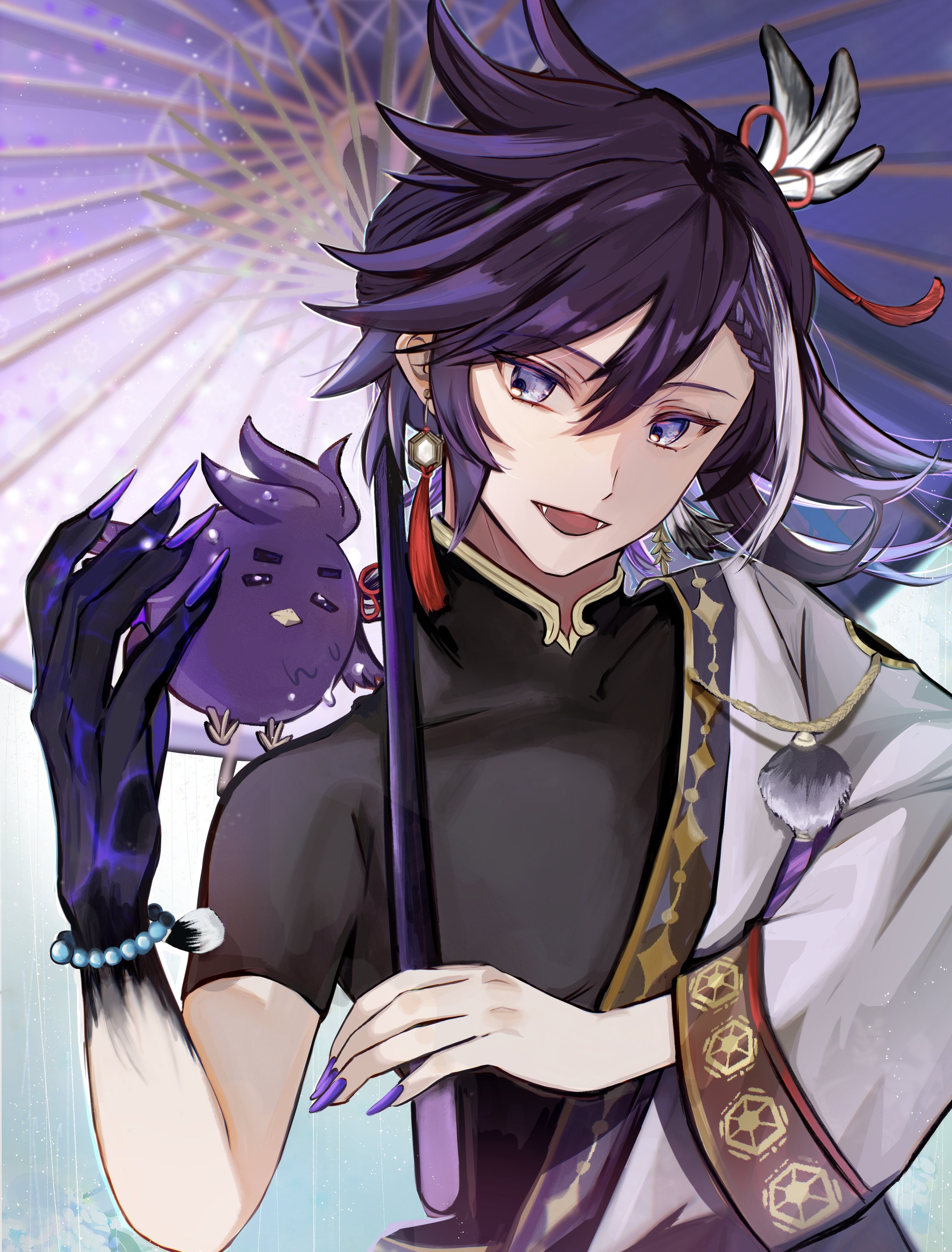 1boy absurdres banzoin_hakka banzoin_hakka_(1st_costume) bead_bracelet beads bird bishounen black_skin blue_eyes bracelet colored_skin earrings fangs feather_hair_ornament feathers hair_between_eyes hair_ornament hakkito_(banzoin_hakka) highres holding holding_umbrella holostars holostars_english jewelry long_hair looking_at_animal male_focus mayuru3teamo mismatched_earrings multicolored_hair multicolored_skin open_mouth ponytail purple_hair purple_nails simple_background streaked_hair tassel tassel_earrings two-tone_skin umbrella upper_body virtual_youtuber white_hair