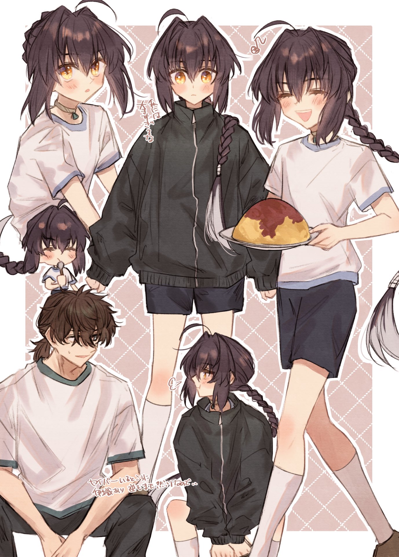 1boy 1other ahoge alternate_costume androgynous black_hair black_jacket black_pants black_shorts blush braid choker closed_eyes eating fate/grand_order fate/samurai_remnant fate_(series) food hair_intakes highres holding holding_plate holding_spoon jacket kneehighs long_braid long_sleeves miyamoto_iori_(fate) official_alternate_costume omelet omurice pants plate pout printemps puff_of_air shirt short_sleeves shorts sidelocks single_braid sitting smile socks spoon standing track_jacket translated white_shirt white_socks yamato_takeru_(fate) yamato_takeru_(fgo_fes._2024)_(fate) yellow_eyes