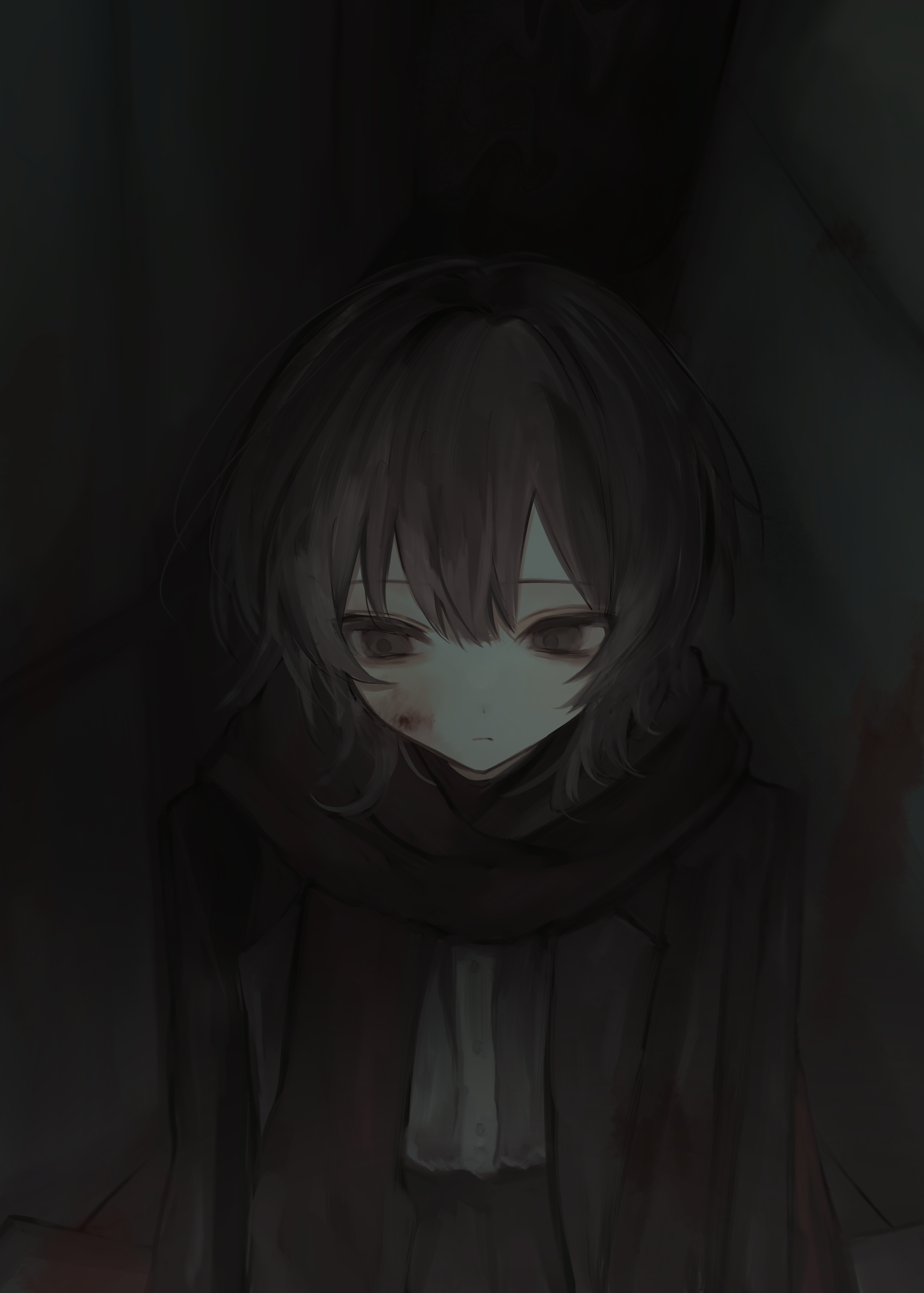 1girl :| absurdres blood blood_on_face brown_coat brown_eyes brown_hair buttons closed_mouth coat dark depressed dot_nose hair_intakes highres kanau_(u_u_zzx) medium_hair original red_scarf scarf shirt solo stairs upper_body white_shirt wolf_cut