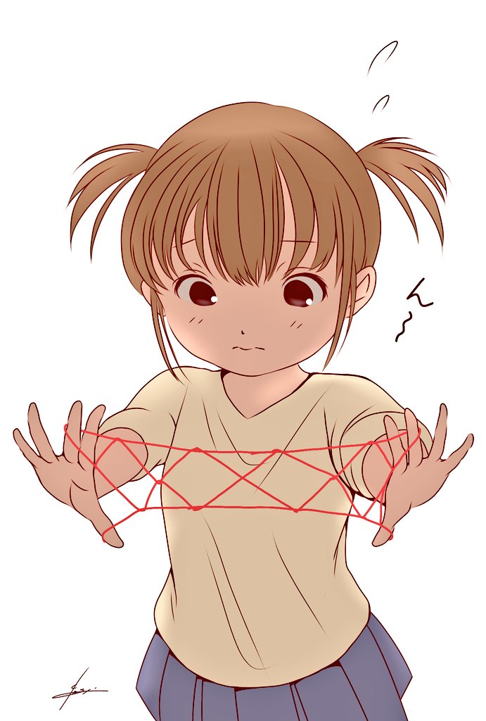 1girl backlighting blue_skirt brown_hair cat's_cradle child closed_mouth flying_sweatdrops original palms pleated_skirt shirt short_twintails signature simple_background skirt solo string toshi_chihiro2 twintails white_background
