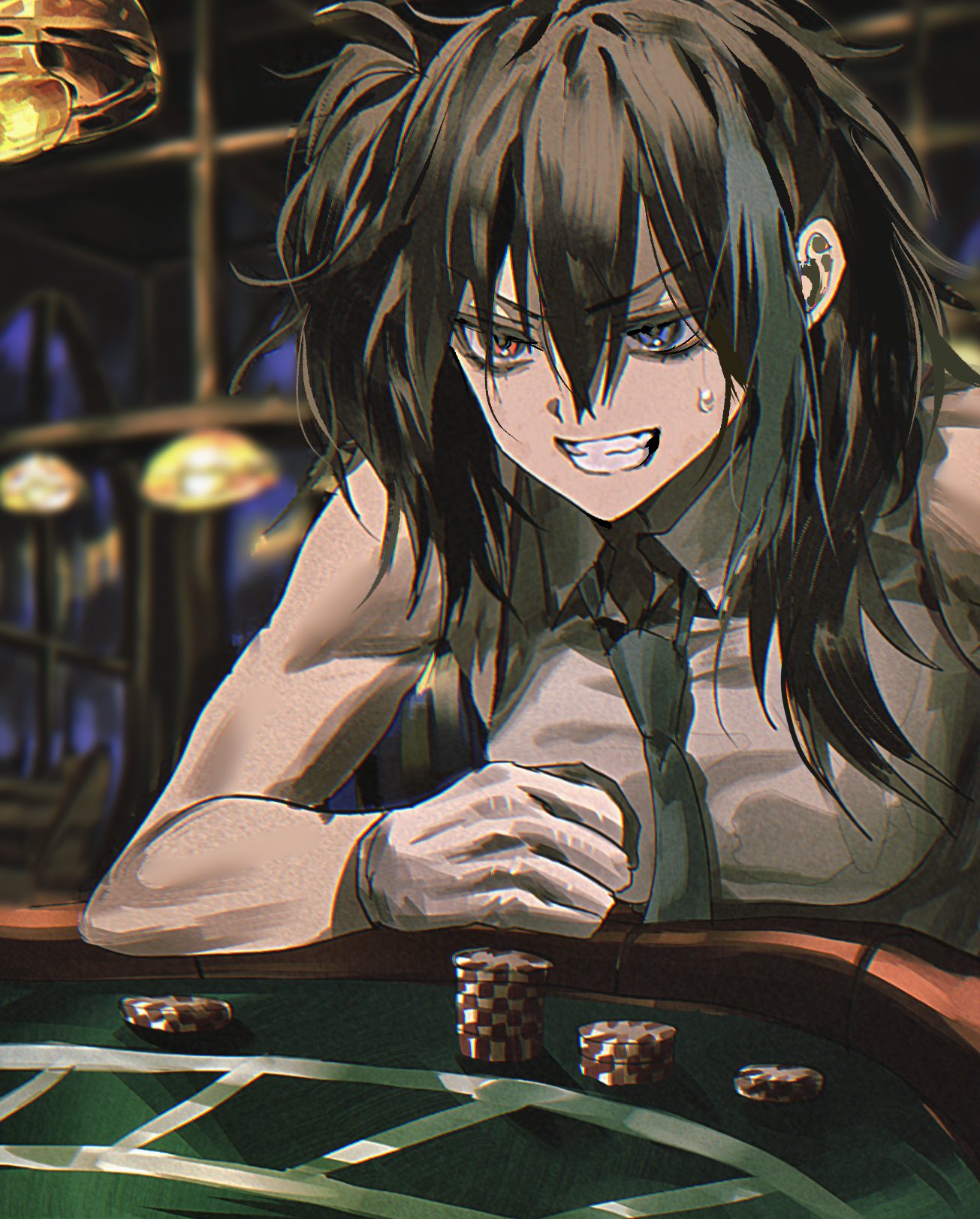 1girl bare_shoulders black_hair blue_eyes blue_hair blue_necktie casino casino_card_table gloves heterochromia highres indoors multicolored_hair muscular muscular_female necktie poker_chip poker_table red_eyes santa_(ssanpanty) shirt sleeveless sleeveless_shirt small_sweatdrop solo streaked_hair table teeth twintails utau white_gloves white_shirt yokune_ruko