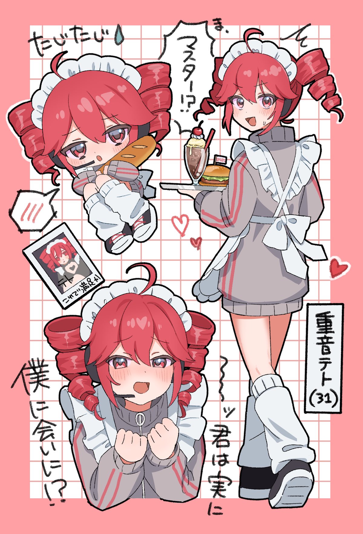 1girl ahoge alternate_costume apron baguette border bread burger chibi double_vertical_stripe drill_hair food frilled_apron frills from_behind grey_jacket grid_background headset heart hidaka_ui highres holding holding_food holding_tray ice_cream ice_cream_float jacket jersey_maid kasane_teto leg_warmers long_sleeves looking_at_viewer looking_back maid maid_apron maid_headdress multiple_views open_mouth outside_border pink_border red_eyes red_hair shoes sneakers spoken_blush standing track_jacket tray twin_drills unconventional_maid utau white_apron white_background white_leg_warmers