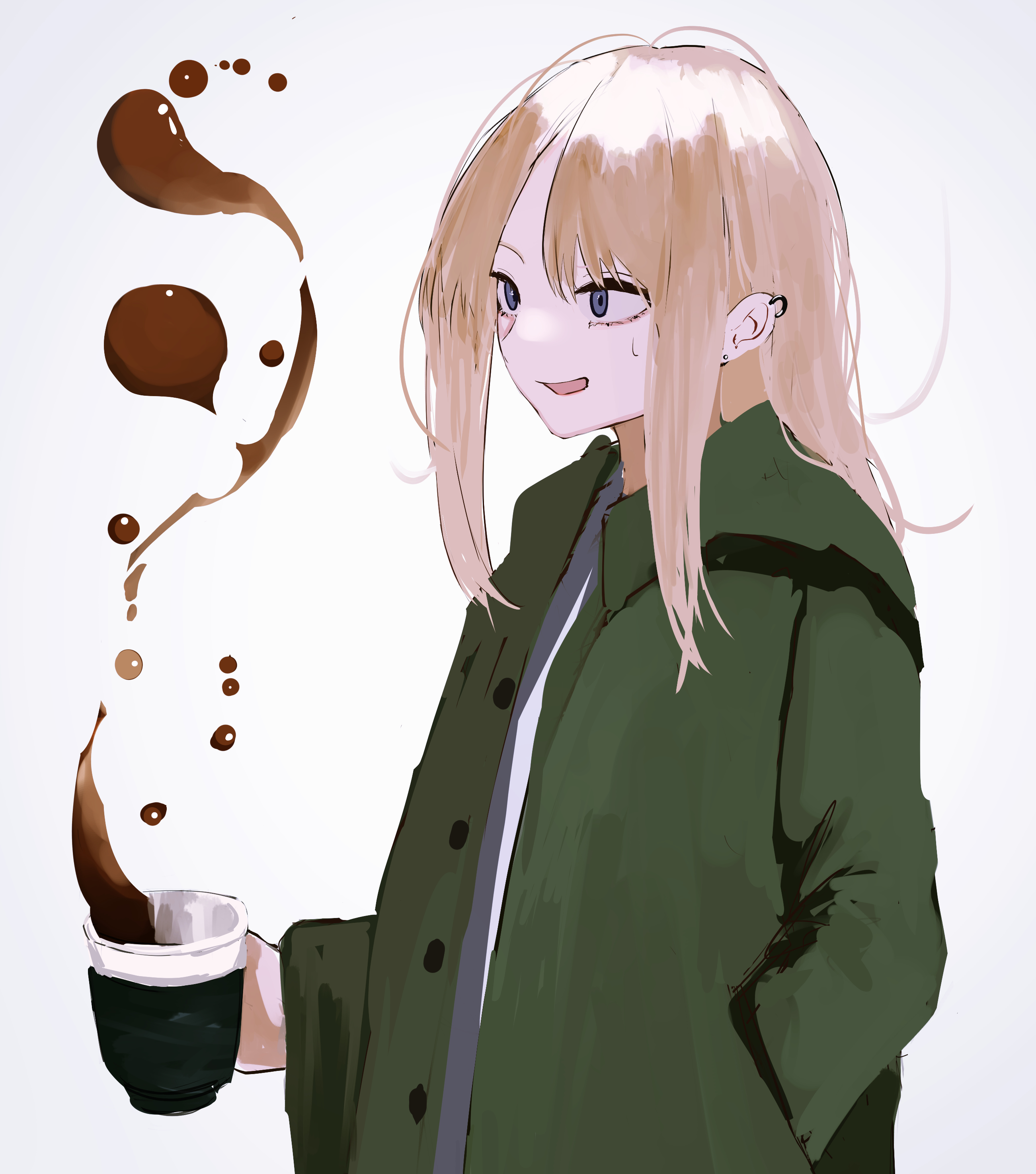 1girl absurdres aegyo_sal blonde_hair blue_eyes buttons coat coffee commentary_request cup disposable_coffee_cup disposable_cup ear_piercing earrings eyelashes from_side green_coat hand_in_pocket highres holding holding_cup jewelry long_hair long_sleeves messy_hair original parted_bangs piercing pikuson sidelocks simple_background smile solo sweatdrop white_background