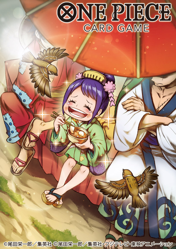 1girl 2boys ^_^ bird bowl child closed_eyes commentary_request copyright_name crossed_arms flip-flops happy_tears hat holding holding_bowl japanese_clothes kimono kurozumi_tama monkey_d._luffy multiple_boys nekobayashi official_art one_piece one_piece_card_game purple_hair red_kimono roronoa_zoro sandals sidelocks sitting sparkle stitched_torso stitches straw_hat tears umbrella