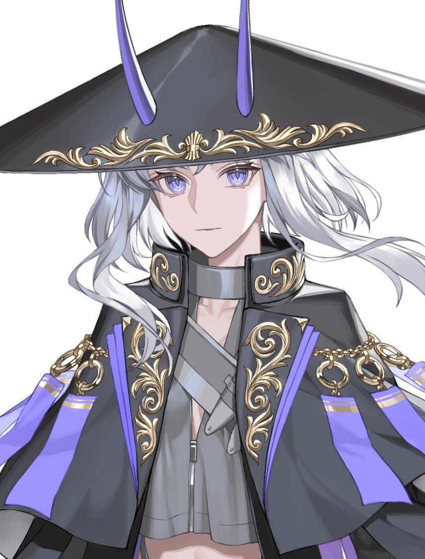 1girl capelet collarbone expressionless grey_hair grey_shirt hat horns jingasa looking_at_viewer original purple_eyes shirt short_hair_with_long_locks solo tsuki-shigure white_background wind wind_lift