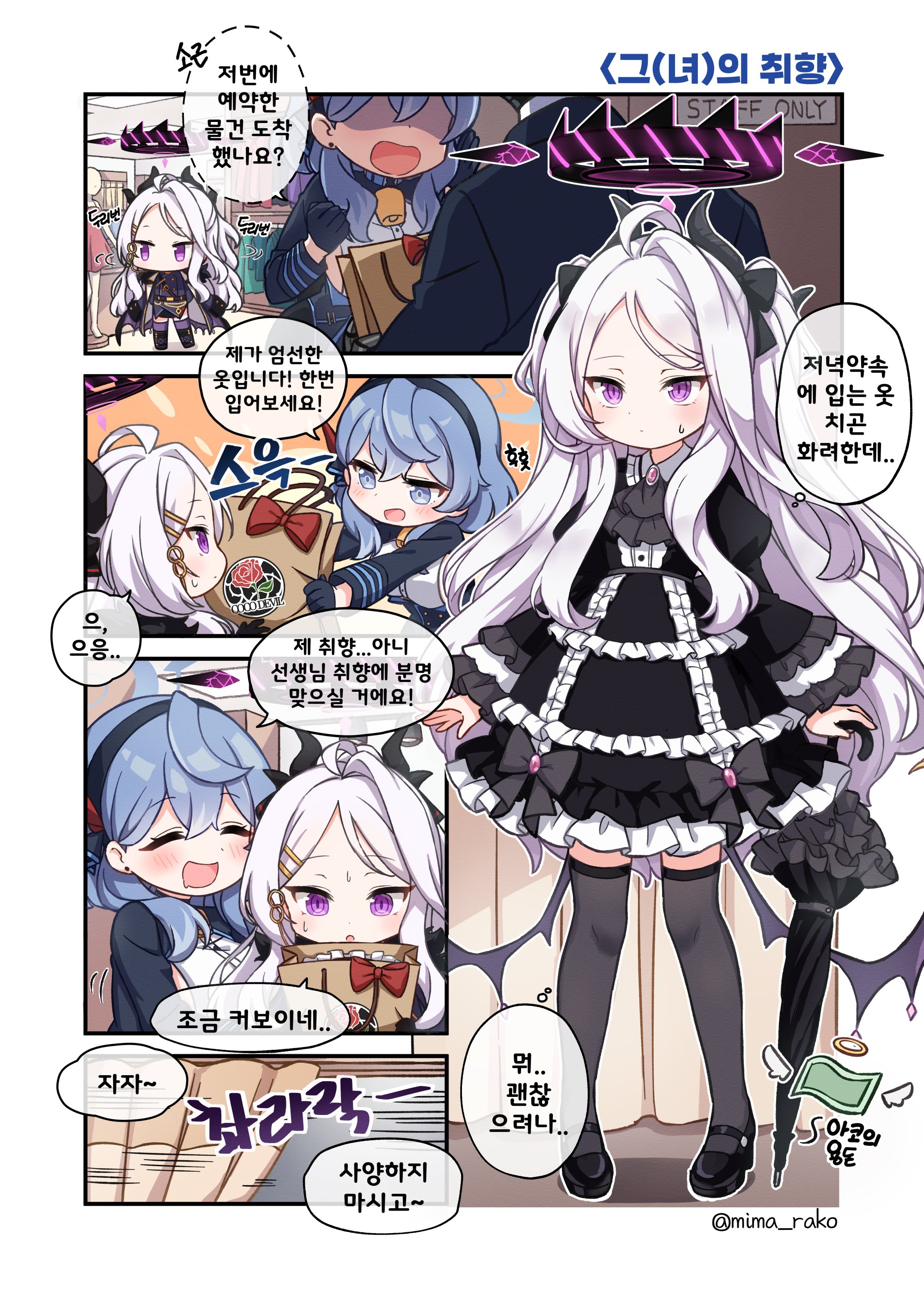 1other 2girls absurdres ako_(blue_archive) alternate_costume android_(blue_archive) angel_wings bag banknote black_dress blue_archive blush clothes_shop demon_girl demon_horns demon_wings dress embarrassed frilled_dress frills halo highres hina_(blue_archive) holding holding_umbrella horns korean_text lolita_fashion money multiple_girls paper_bag rako_(mima_rako) shop shopping speech_bubble sweatdrop translation_request umbrella wings