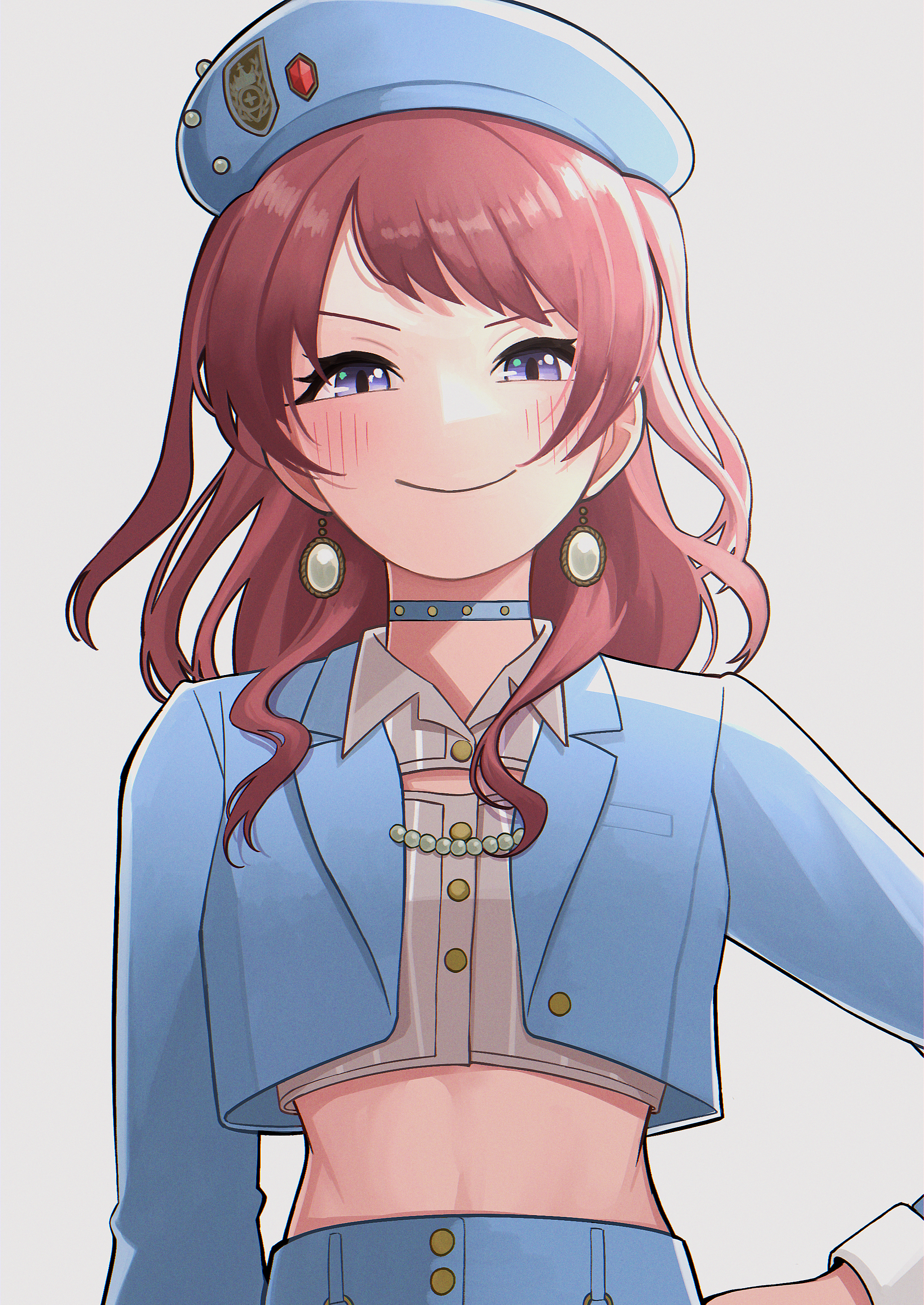 1girl absurdres beret blue_choker blue_hat blue_jacket blush boom_boom_pow_(idolmaster) choker cleavage_cutout clothing_cutout commentary cropped_jacket cropped_shirt gakuen_idolmaster hanami_saki hat highres idolmaster jacket long_hair looking_at_viewer midriff purple_eyes red_hair shirt simple_background smile solo tk_nomanomayei white_background white_shirt