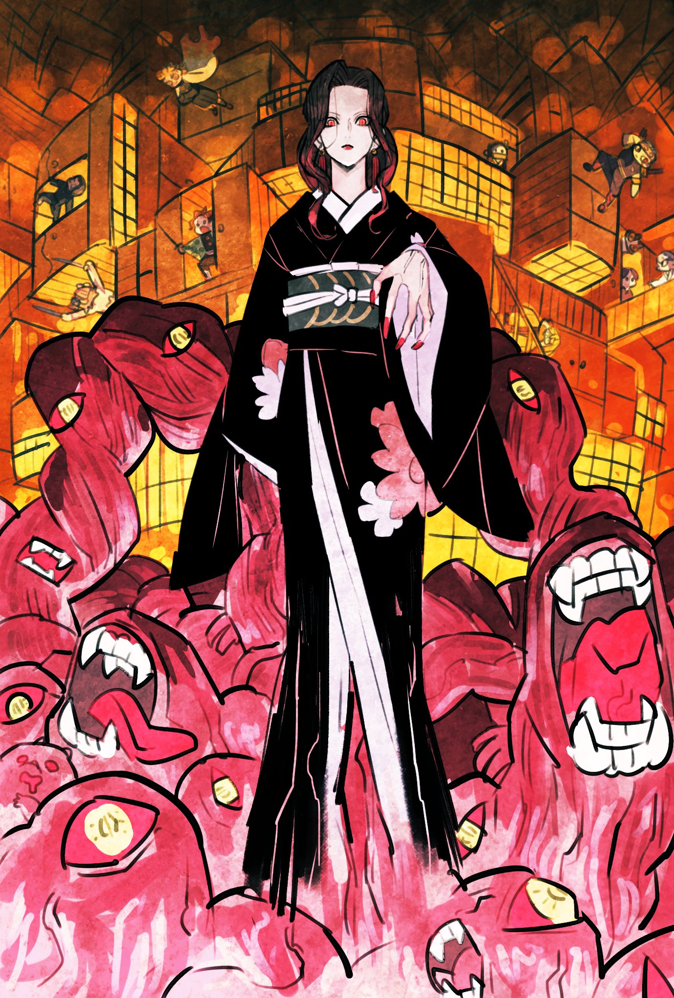 3girls 6+girls agatsuma_zenitsu black_hair black_kimono demon_girl hashibira_inosuke highres japanese_clothes kamado_nezuko kamado_tanjirou kibutsuji_muzan kibutsuji_muzan_(female) kimetsu_no_yaiba kimono looking_at_viewer monster multiple_girls murata_(kimetsu_no_yaiba) red_eyes rengoku_kyoujurou takeuchi_ryousuke tamayo_(kimetsu_no_yaiba) uzui_tengen yushiro_(kimetsu_no_yaiba)