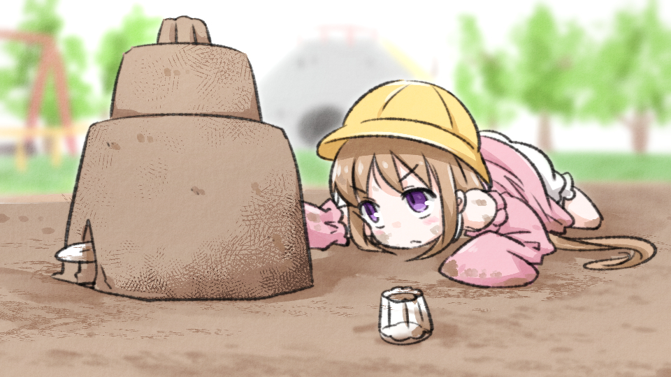 1girl bare_shoulders bloomers blurry blurry_background brown_hair building_sand_sculpture concentrating cup digging dress hat long_hair lying neon-tetora on_stomach outdoors pink_dress playground playing purple_eyes sand sand_castle sand_sculpture school_hat shovel solo tsukuyomi_ai underwear v-shaped_eyebrows voiceroid white_bloomers yellow_hat