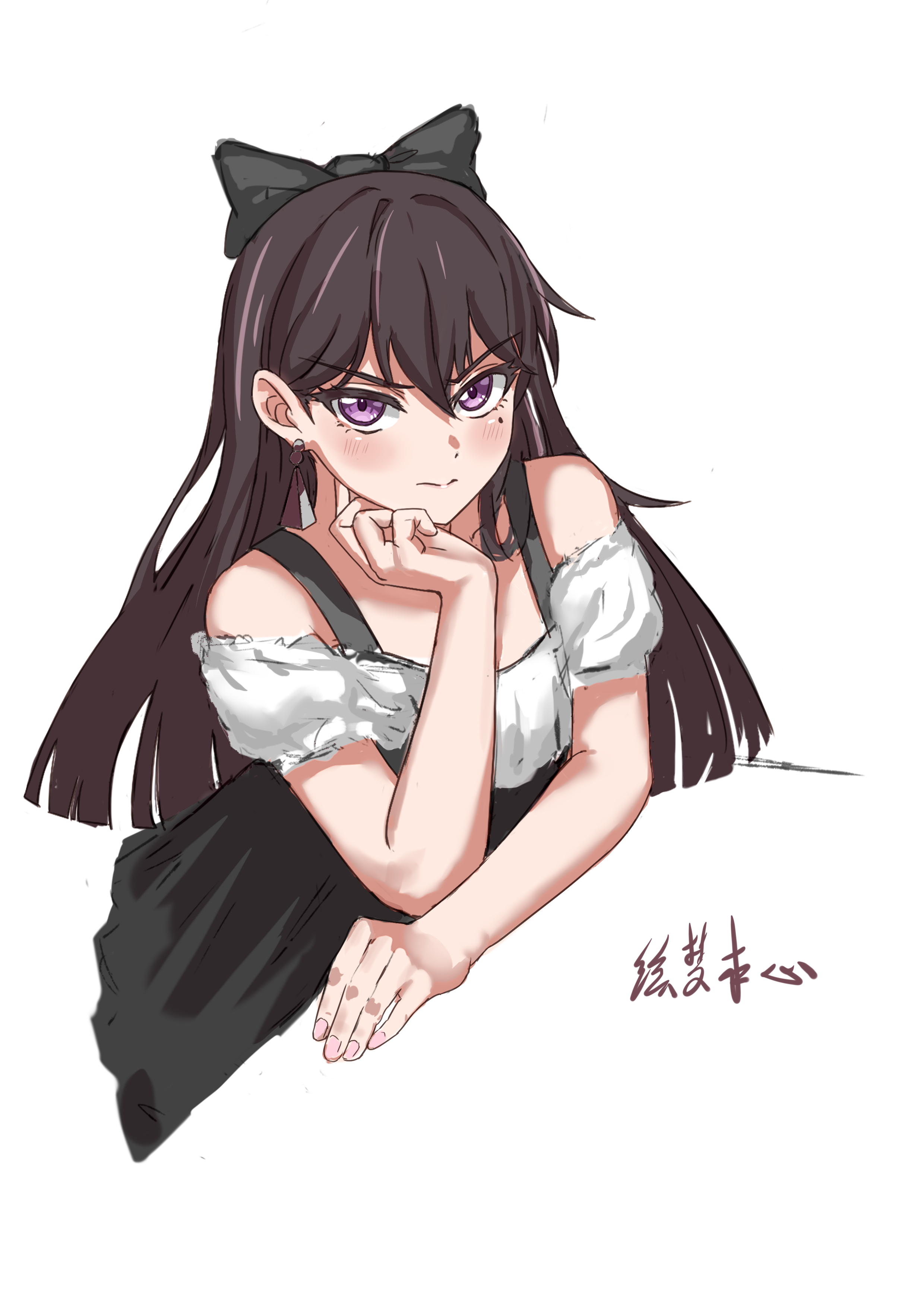 1girl absurdres artist_name bang_dream! bang_dream!_it's_mygo!!!!! black_bow black_skirt blush bow brown_hair chinese_commentary closed_mouth commentary_request earrings hair_bow highres hui_meng_ben_xin jewelry long_hair looking_at_viewer mole mole_under_eye off-shoulder_shirt off_shoulder purple_eyes shiina_taki shirt simple_background skirt solo upper_body v-shaped_eyebrows white_background white_shirt