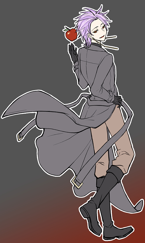 1boy apple belt black_boots black_gloves boots brown_pants chinese_commentary coat commentary_request food fruit full_body gloves gradient_background grey_belt grey_coat hand_on_own_hip male_focus nekomiya_nayile open_belt open_mouth outline pants purple_hair red_eyes saibou_shinkyoku short_hair simple_background smile solo theodore_riddle white_outline