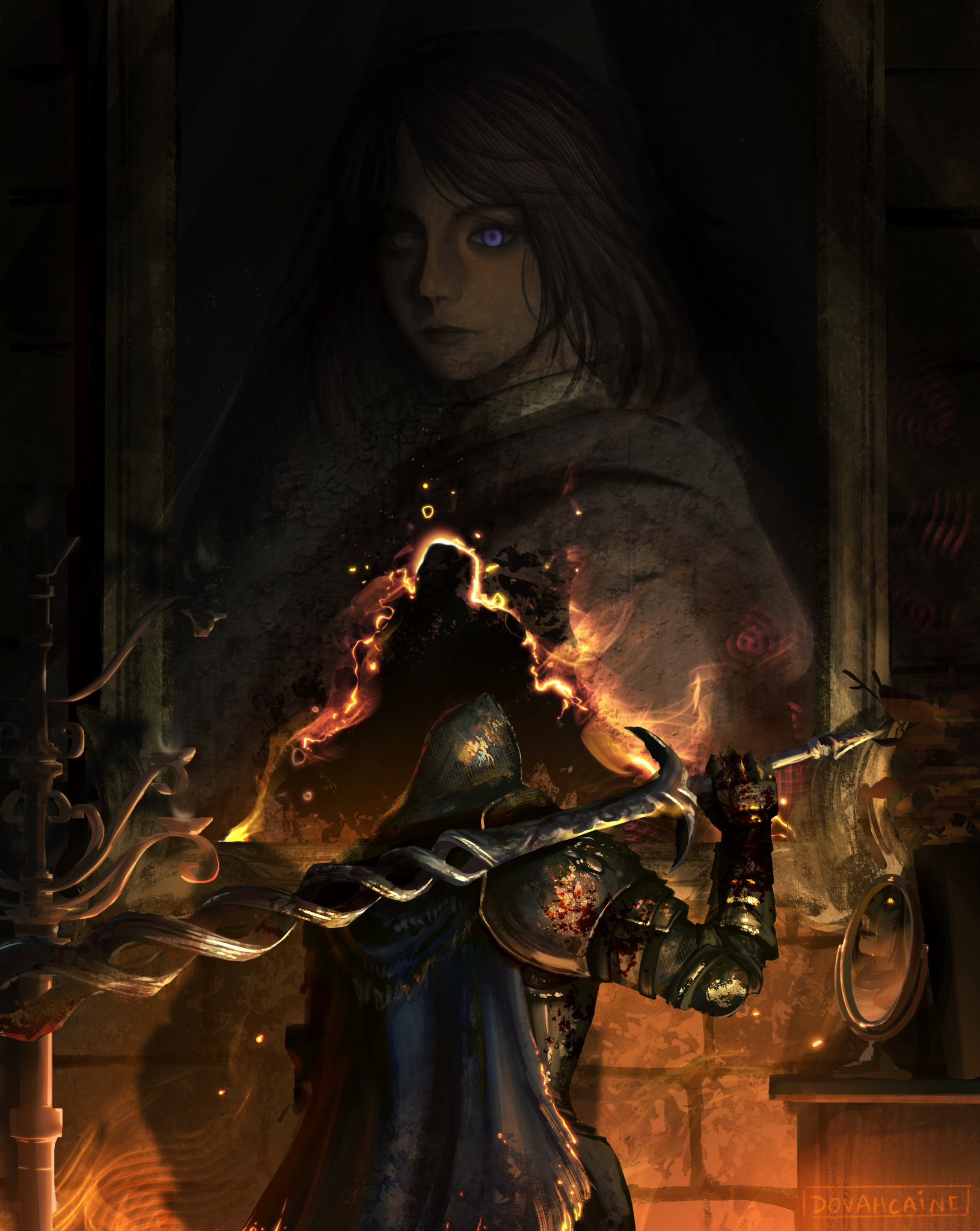 2girls armor artist_name black_hair black_lips blue_cape breastplate brown_hair cape cloak commentary dovahcaine elden_ring embers english_commentary fire full_armor gauntlets glowing glowing_eyes highres holding holding_sword holding_weapon hood knight looking_up lord_of_the_frenzied_flame_(elden_ring) medium_hair melina_(elden_ring) mirror multiple_girls painting_(object) pauldrons picture_frame pidge_(dovahcaine) shoulder_armor shoulder_plates sword weapon yellow_eyes
