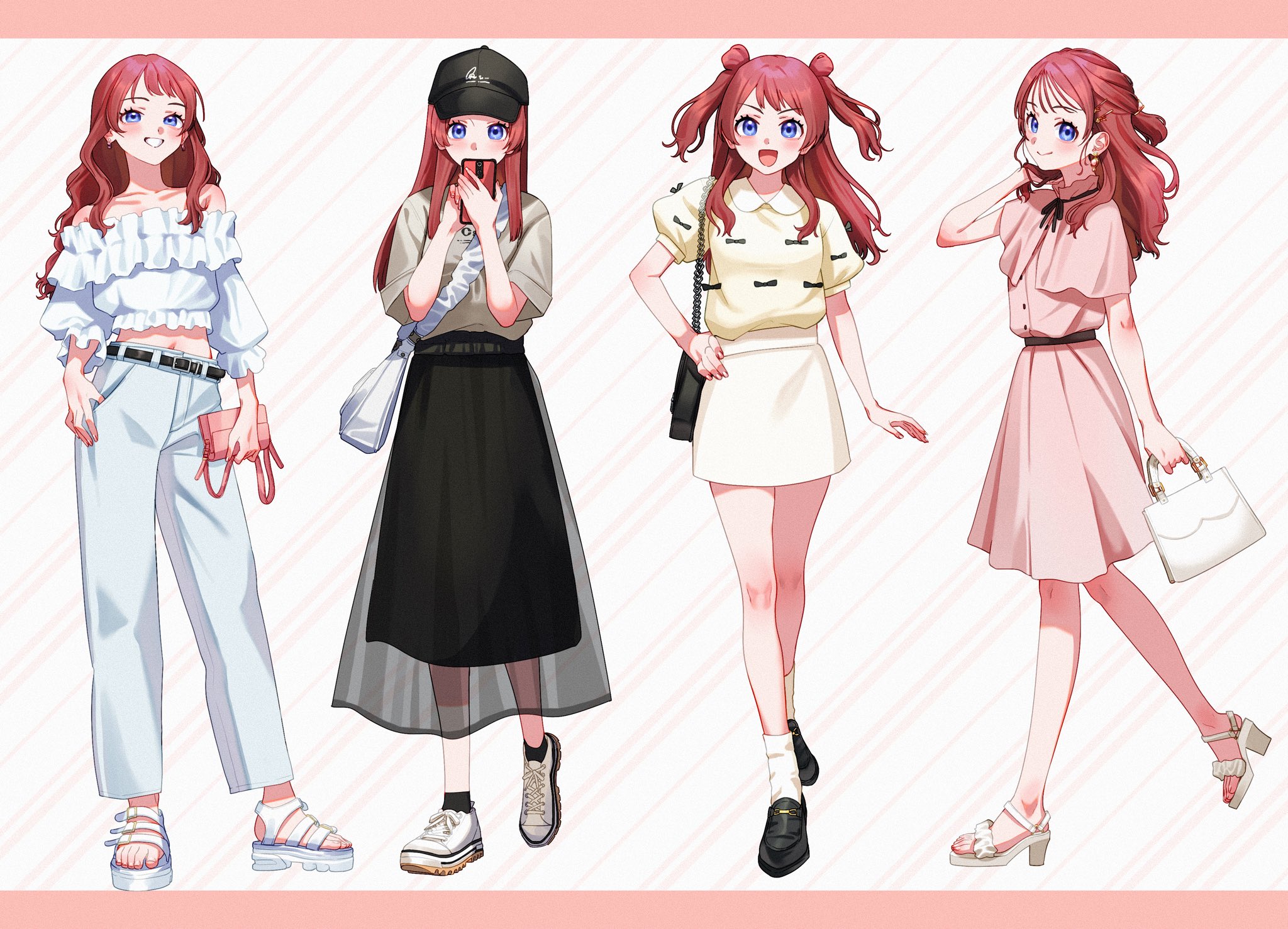 1girl alternate_costume bag baseball_cap black_hat black_skirt blue_eyes blush capelet casual cellphone collarbone commentary_request dress full_body gakuen_idolmaster grey_pants half_updo hanami_saki hat highres holding holding_bag holding_phone idolmaster long_hair looking_at_viewer multiple_views off-shoulder_shirt off_shoulder pants phone pink_capelet pink_dress red_hair shirt shoes skirt smile sneakers straight_hair tamayume two_side_up white_shirt white_skirt yellow_shirt