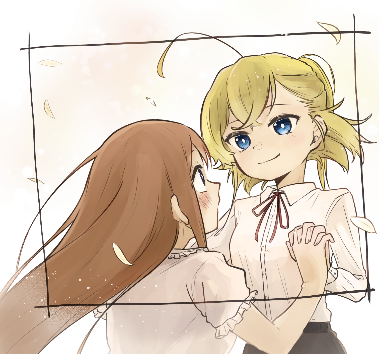 2girls ahoge back belt black_belt blonde_hair blue_eyes blush brown_hair buttons closed_mouth collared_shirt crossed_bangs dress fingernails frills grey_pants hair_between_eyes hands_up highres holding holding_hands long_hair long_sleeves looking_at_another multiple_girls neck_ribbon pants petals ponytail puffy_long_sleeves puffy_short_sleeves puffy_sleeves red_ribbon ribbon shirt short_sleeves sidelocks simple_background smile standing tanya_degurechaff viktoriya_ivanovna_serebryakov white_background white_dress white_shirt youjo_senki yuri yuuki_(qgbugtbhbxn5ts9)