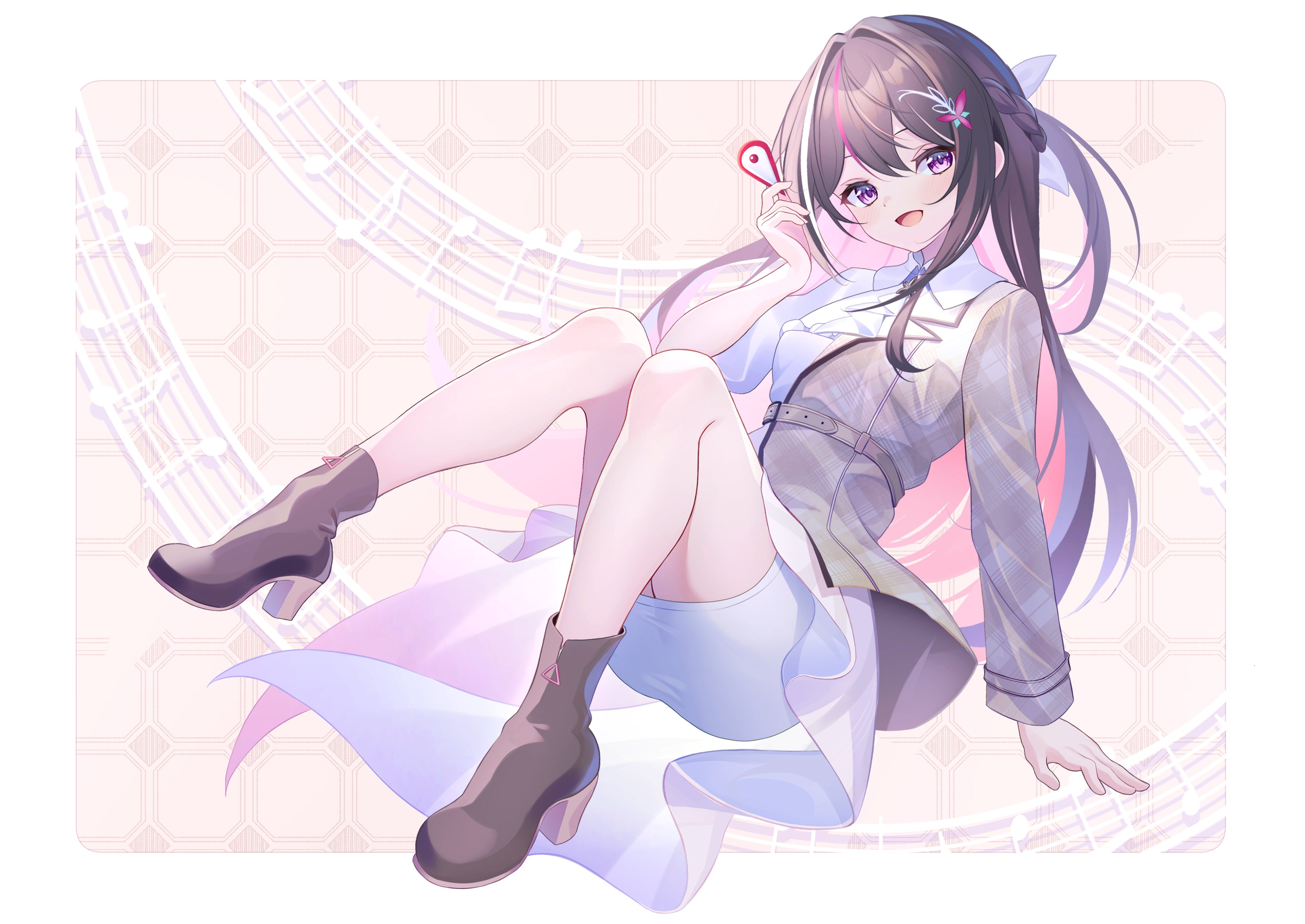 1girl :d absurdres anichika ascot azki_(4th_costume)_(hololive) azki_(hololive) black_hair boots border braid brown_boots brown_jacket collared_dress colored_inner_hair commentary_request double-parted_bangs dress flower full_body geoguessr hair_between_eyes hair_flower hair_intakes hair_ornament hairclip half_up_braid high-low_dress high-low_skirt high_heel_boots high_heels highres holding hololive jacket knees_together_feet_apart knees_up long_hair long_sleeves looking_at_viewer miniskirt multicolored_hair official_alternate_costume official_alternate_hairstyle open_mouth pink_hair purple_eyes sidelocks skirt skirt_under_dress smile solo streaked_hair very_long_hair virtual_youtuber white_ascot white_border white_dress white_hair white_skirt
