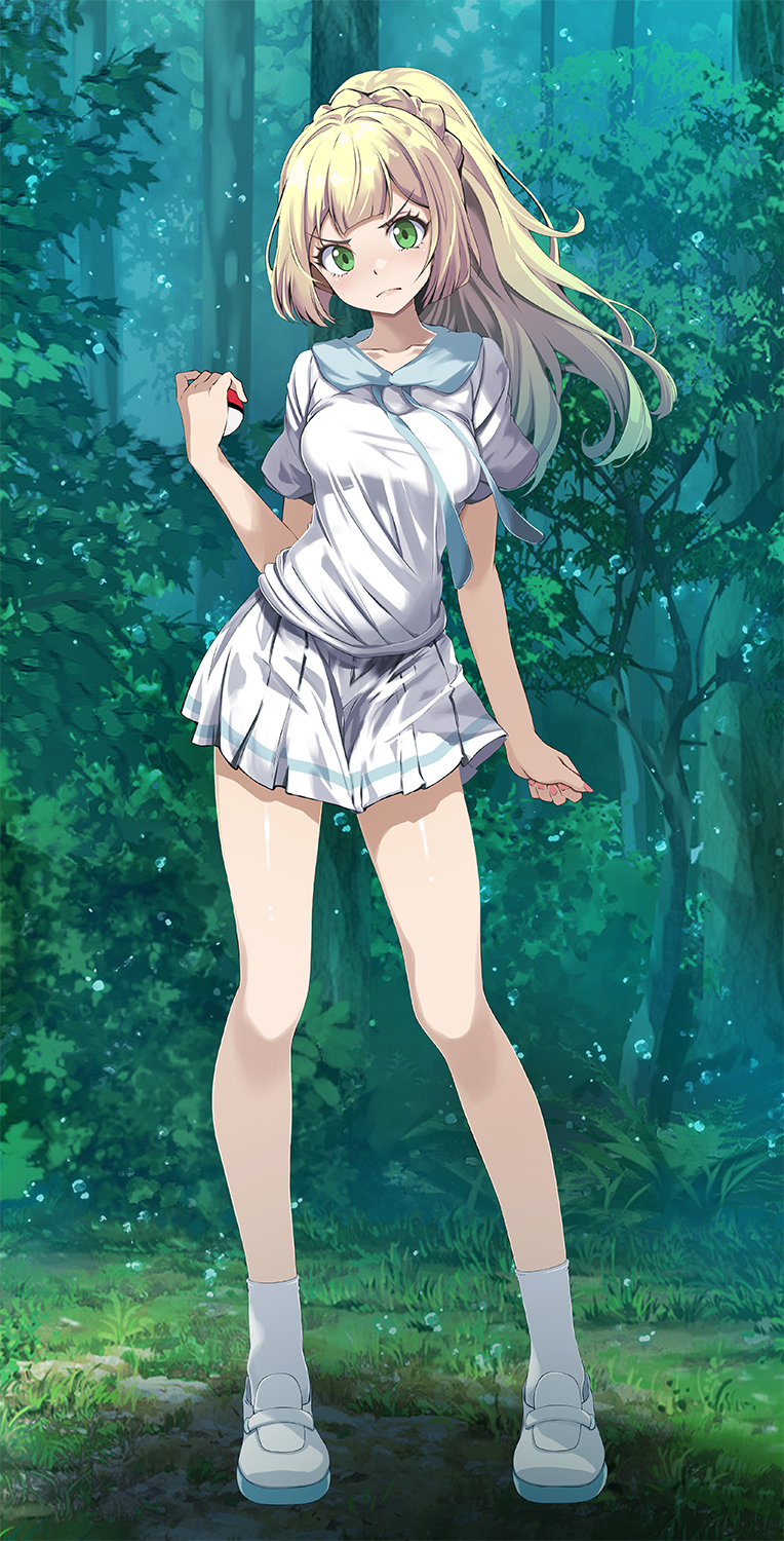 1girl blonde_hair braid breasts closed_mouth contrapposto day floating_hair forest frown full_body green_eyes high_ponytail highres holding holding_poke_ball lillie_(pokemon) long_hair looking_at_viewer medium_breasts miniskirt nature nintendo outdoors pleated_skirt poke_ball pokemon pokemon_sun_and_moon ponytail shirt short_sleeves skirt socks solo standing tsukishiro_saika v-shaped_eyebrows white_footwear white_shirt white_skirt white_socks
