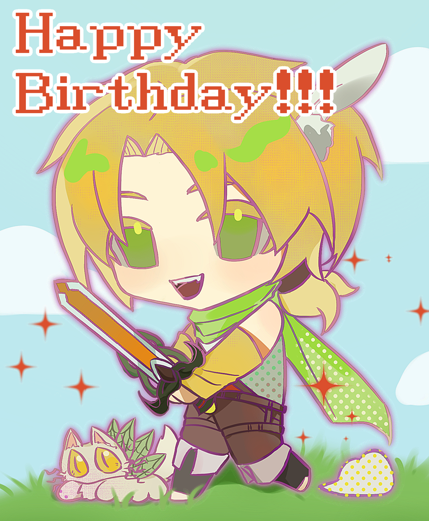 1boy black_boots blonde_hair boots brown_pants chibi chibi_only chinese_commentary cloud colored_eyelashes commentary_request cosplay day detached_sleeves dita_iliner dita_iliner_(cosplay) godzylla_(saibou_shinkyoku) green_eyes green_scarf highres holding holding_sword holding_weapon low_ponytail male_focus moye_qingcha open_mouth outdoors pants parted_bangs ponytail saibou_shinkyoku scarf shinano_eiji smile sword weapon yellow_sleeves