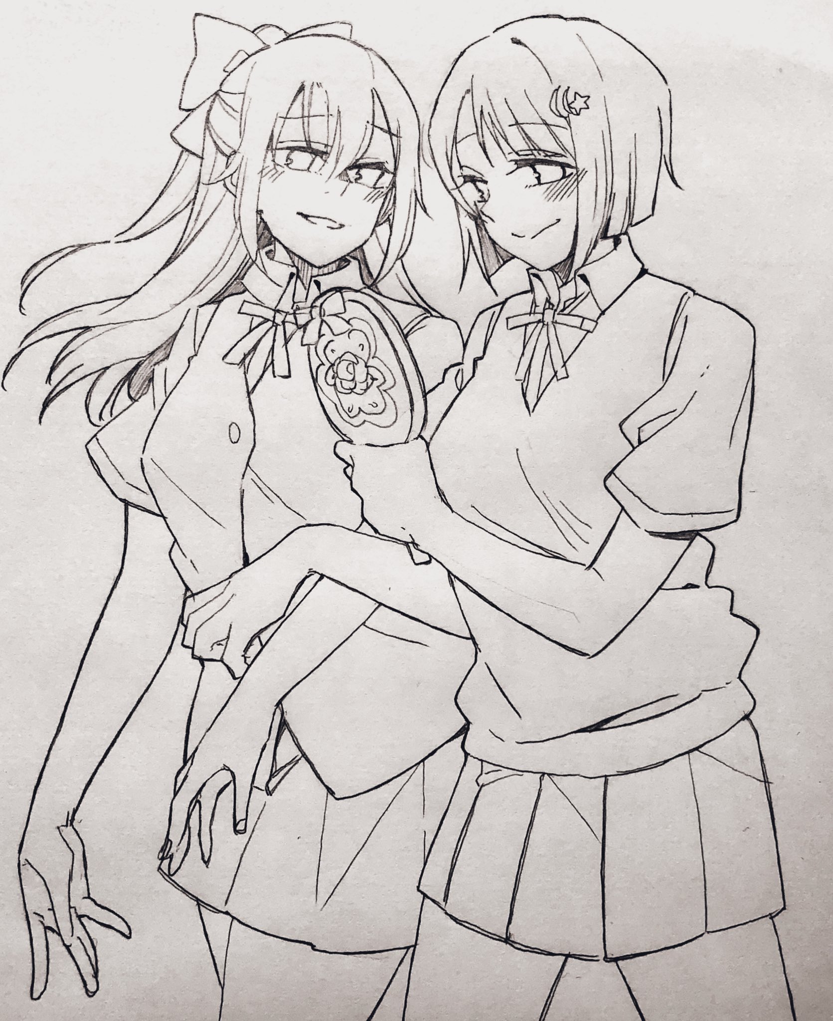 2girls blush closed_mouth commentary_request cowboy_shot greyscale hair_ornament highres holding holding_mirror locked_arms long_hair looking_at_another love_live! love_live!_nijigasaki_high_school_idol_club mirror monochrome multiple_girls mygod55555 nakasu_kasumi neck_ribbon nijigasaki_school_uniform osaka_shizuku parted_lips pleated_skirt ribbon school_uniform short_hair short_sleeves skirt smile star_(symbol) star_hair_ornament sweater_vest traditional_media