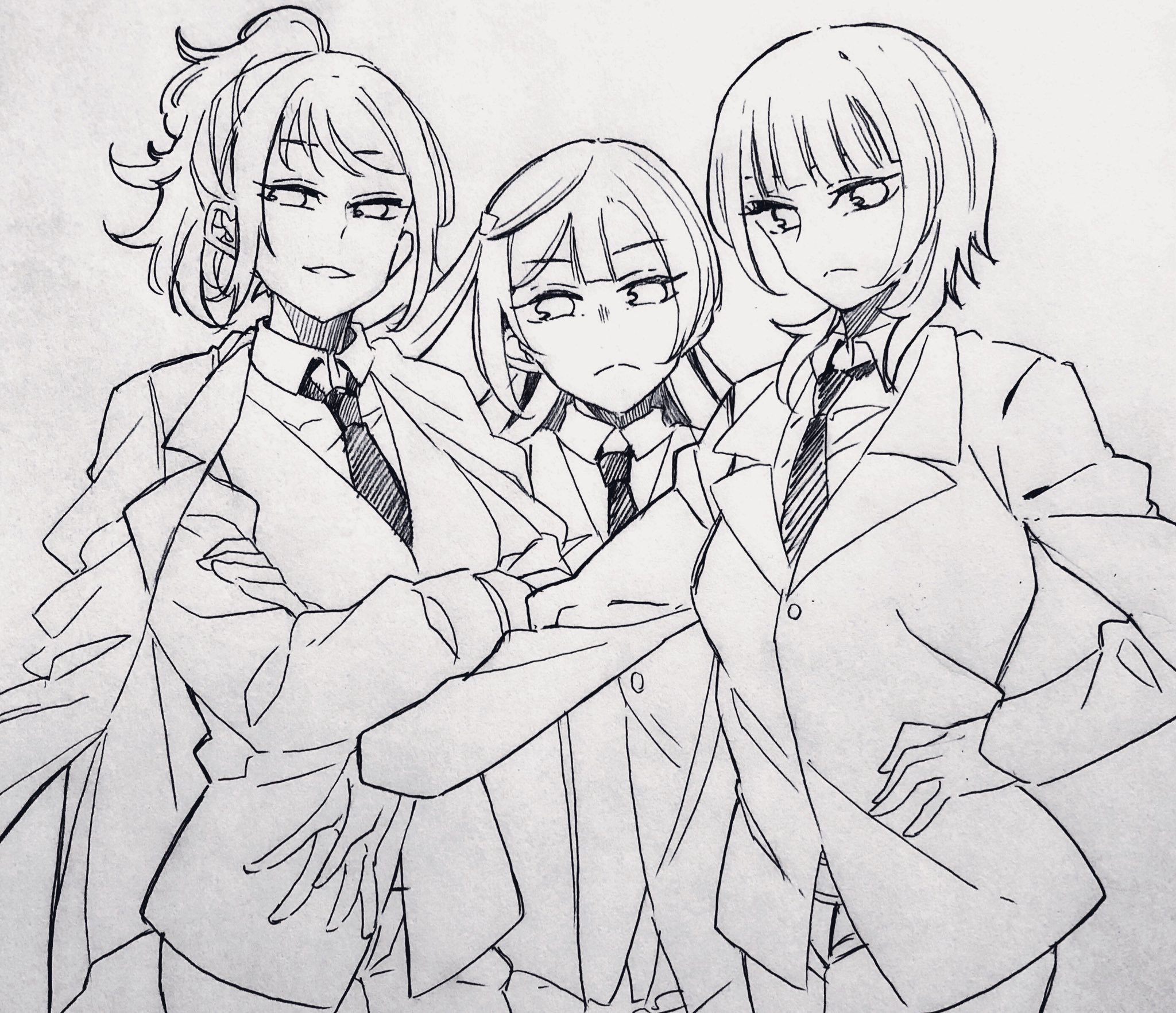 3girls asaka_karin closed_mouth coat coat_on_shoulders commentary_request formal_clothes frown greyscale hand_on_own_hip highres jacket long_hair long_sleeves looking_at_viewer love_live! love_live!_nijigasaki_high_school_idol_club medium_hair miyashita_ai monochrome multiple_girls mygod55555 necktie parted_lips ponytail suit suit_jacket traditional_media wolf_cut yuki_setsuna